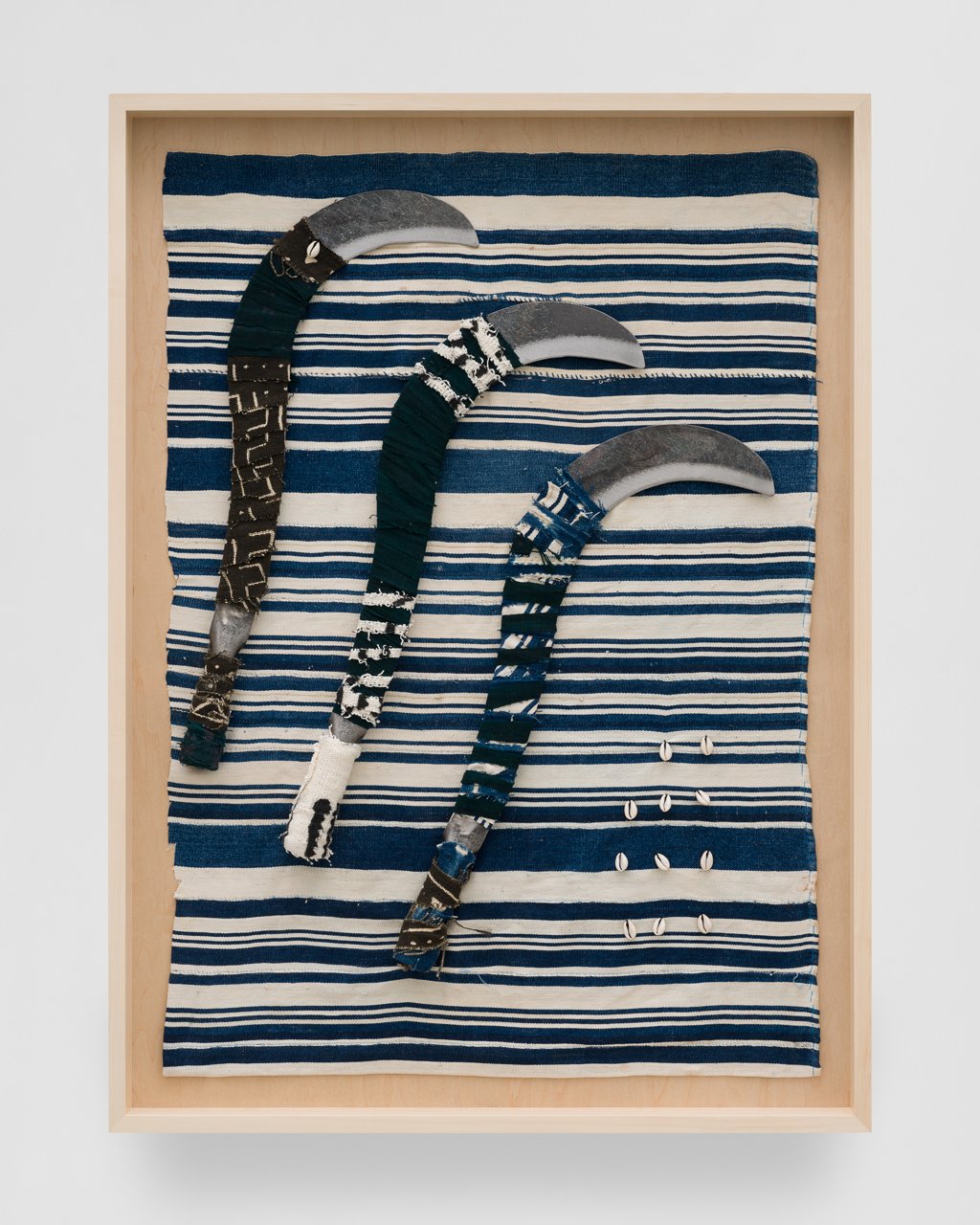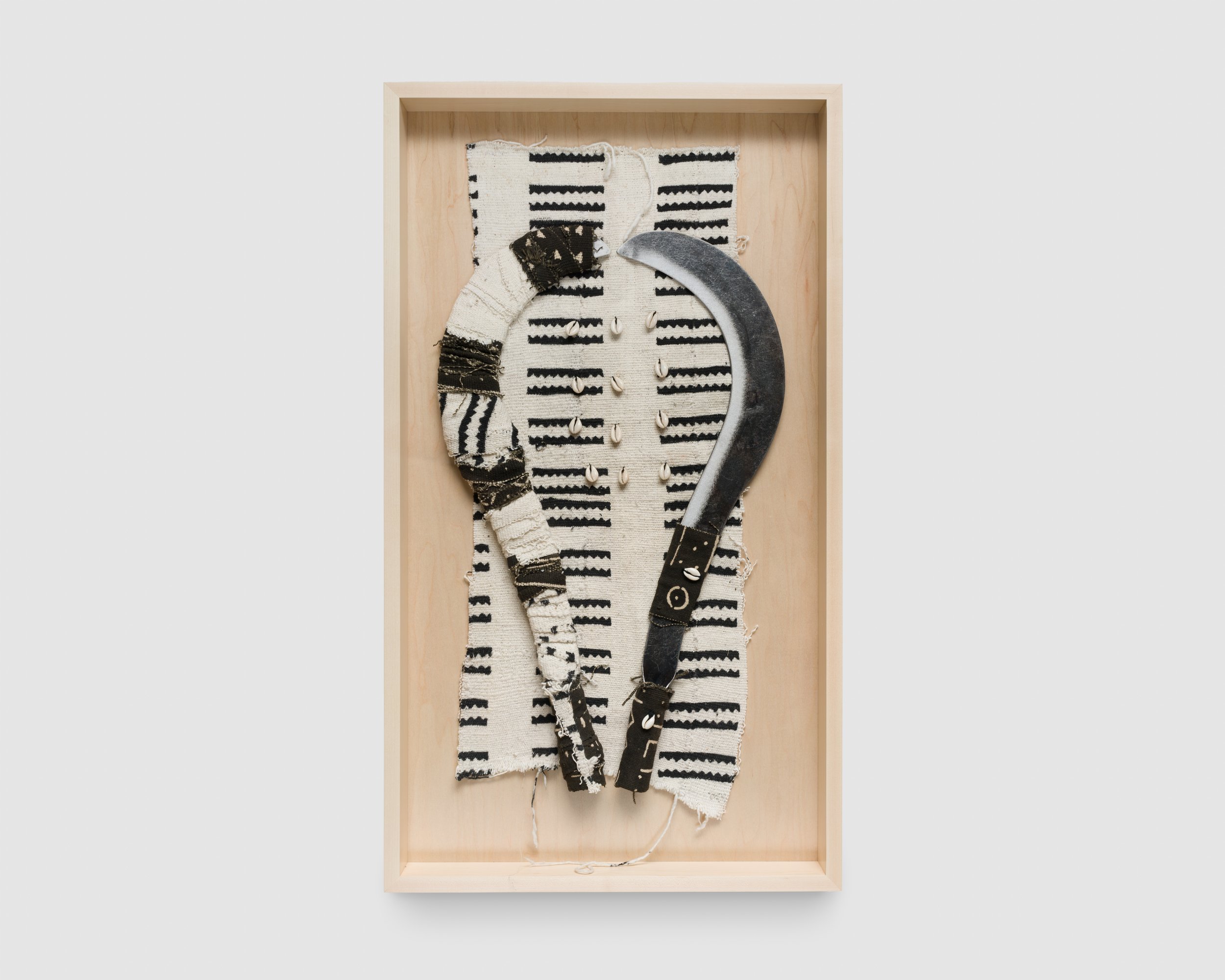 Cullors’ artistic practice, which is in part inspired by Los Angeles’ Black Arts Movement of the 1960s and 1970s, invites the use of artworks as spiritual guardians, creating a legacy of creative offerings that exist beyond the visual plane and become both urgent cultural commentary and spiritual armor. To this end, Cullors has dedicated each piece in Between the Warp and Weft to a different Black woman in her life to whom she wants to extend protection.