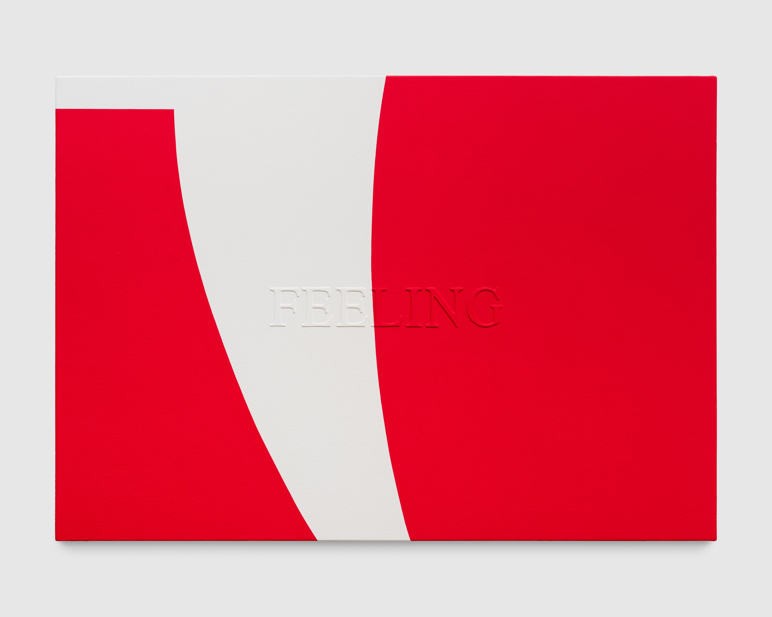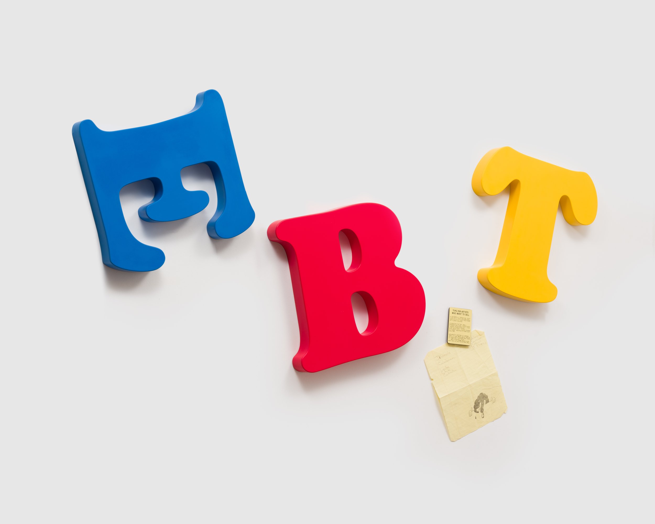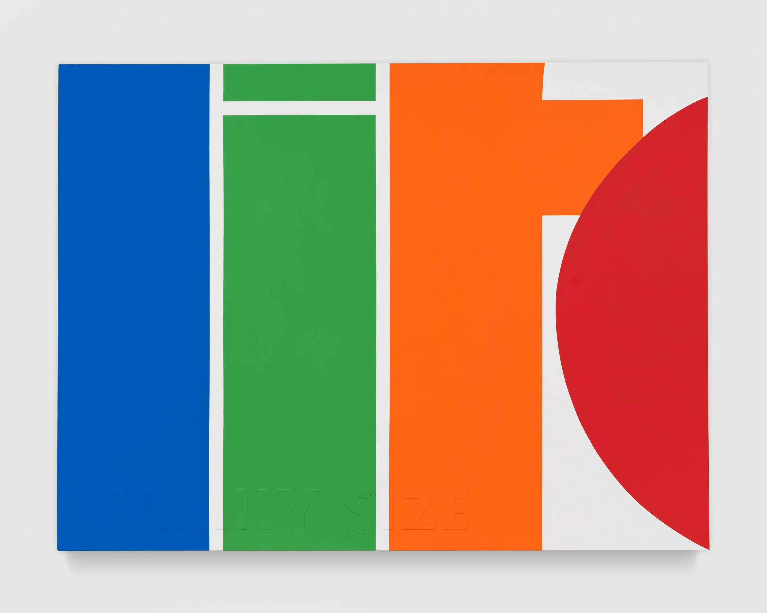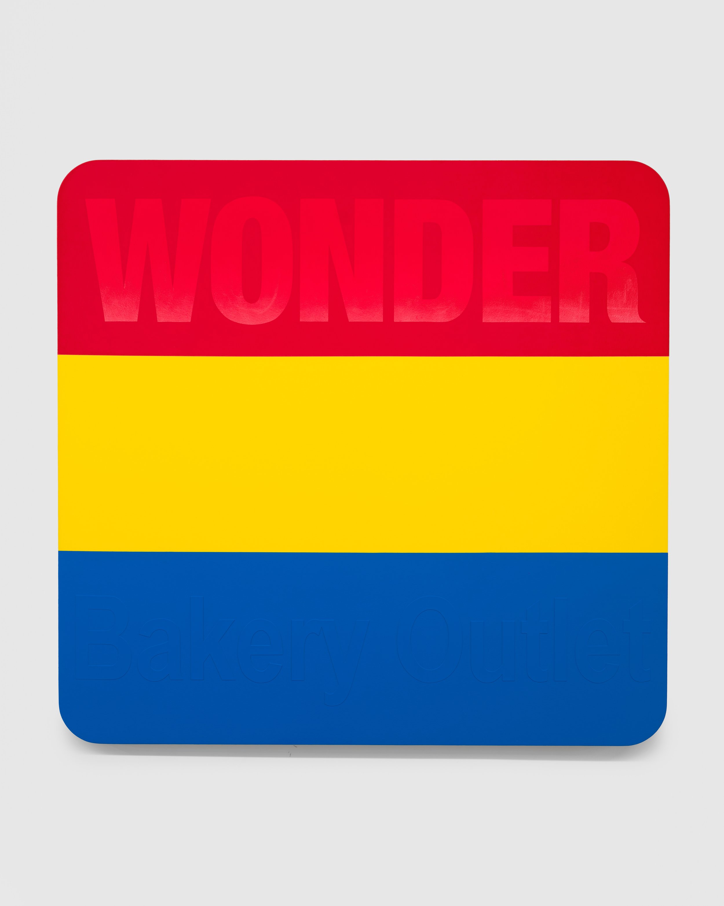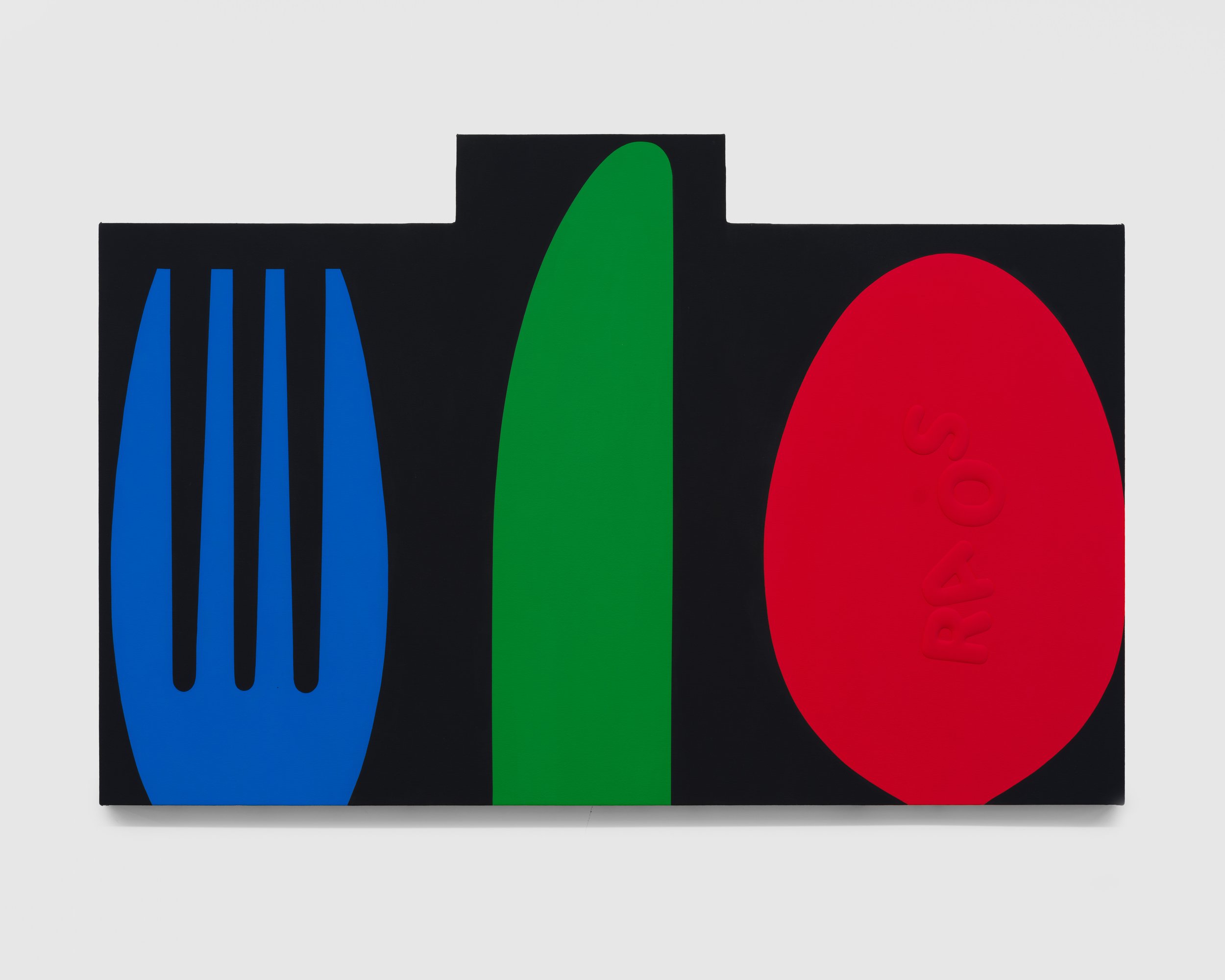Raos brings to his work a deep knowledge of and admiration for his art historical precedents. The vibrant bands of color in Untitled (Outchea getting bread, if you wonder where i’ve been) read like Ellsworth Kelly’s iconic Red, Yellow, Blue paintings turned ninety degrees. But the work also refers to the Wonder Bread factory outlet, whose discounted near-expired foods were a staple of the artist’s childhood. Untitled (Never had the tools), meanwhile, takes its subject and altar-like shape from John Baldessari’s 1988 Banquet, calling into stark contrast the states of plenty and lack on display. Raos gives himself a seat at the table, though, his name playing like alphabet soup across the oval bowl of the spoon.