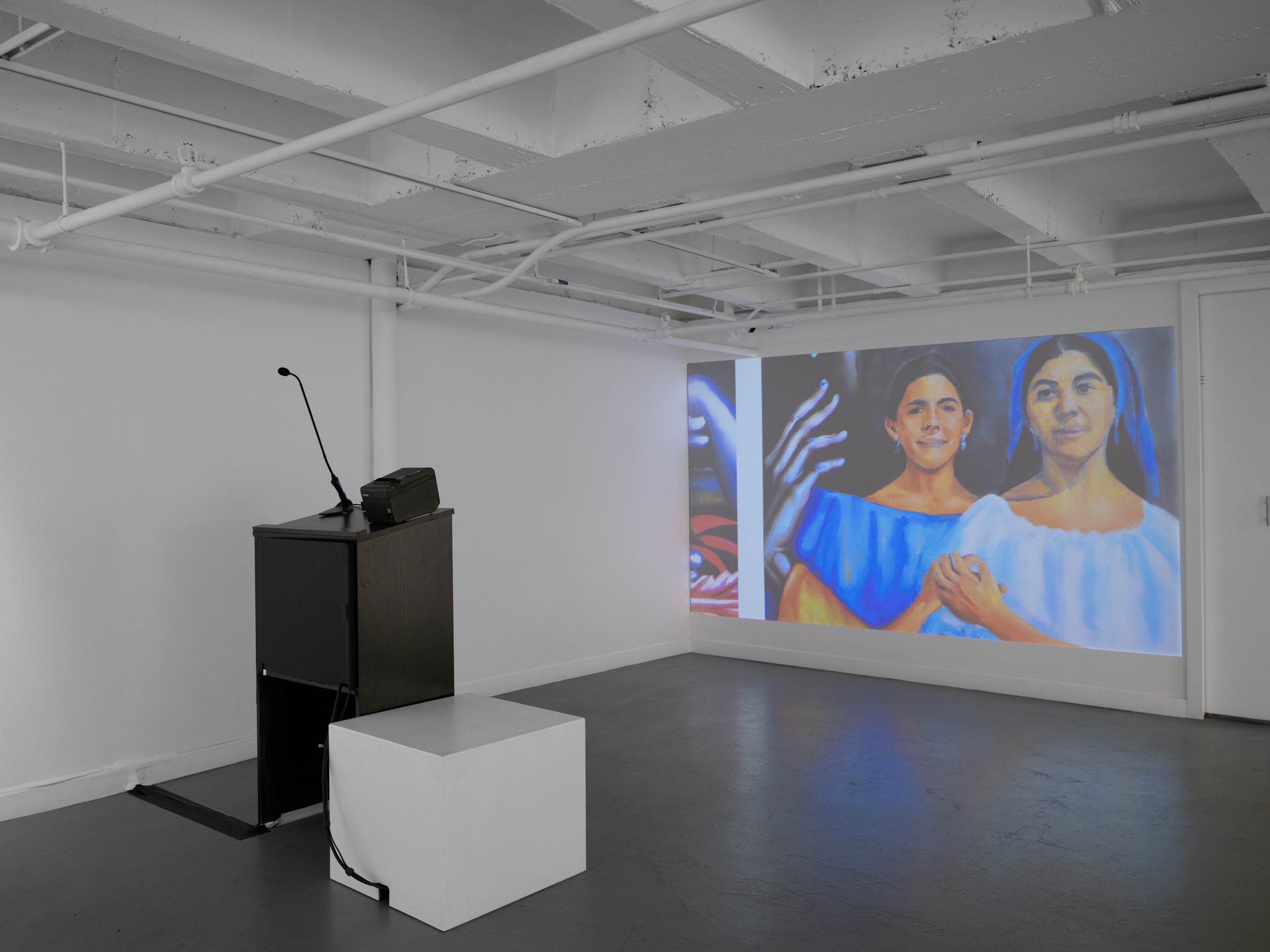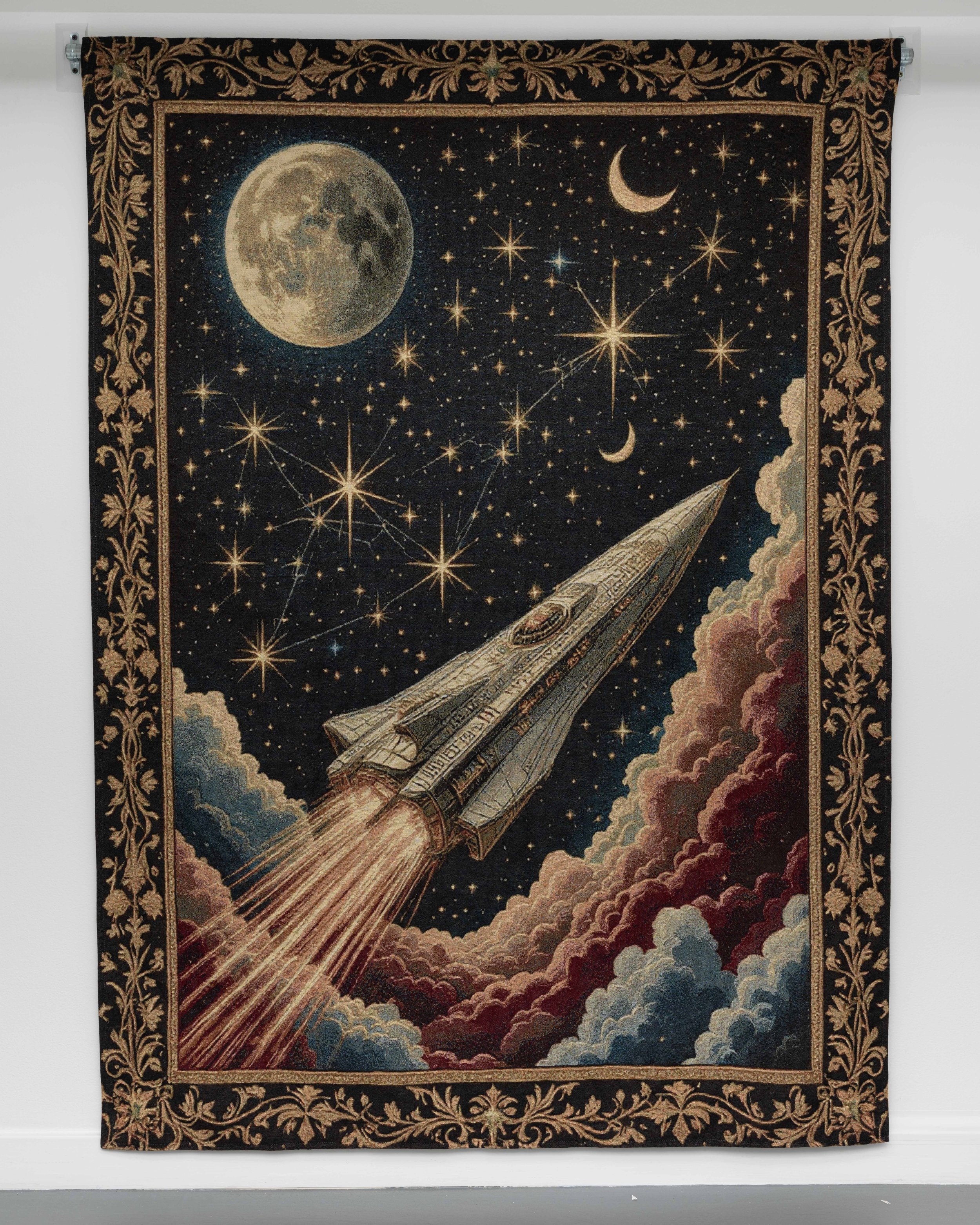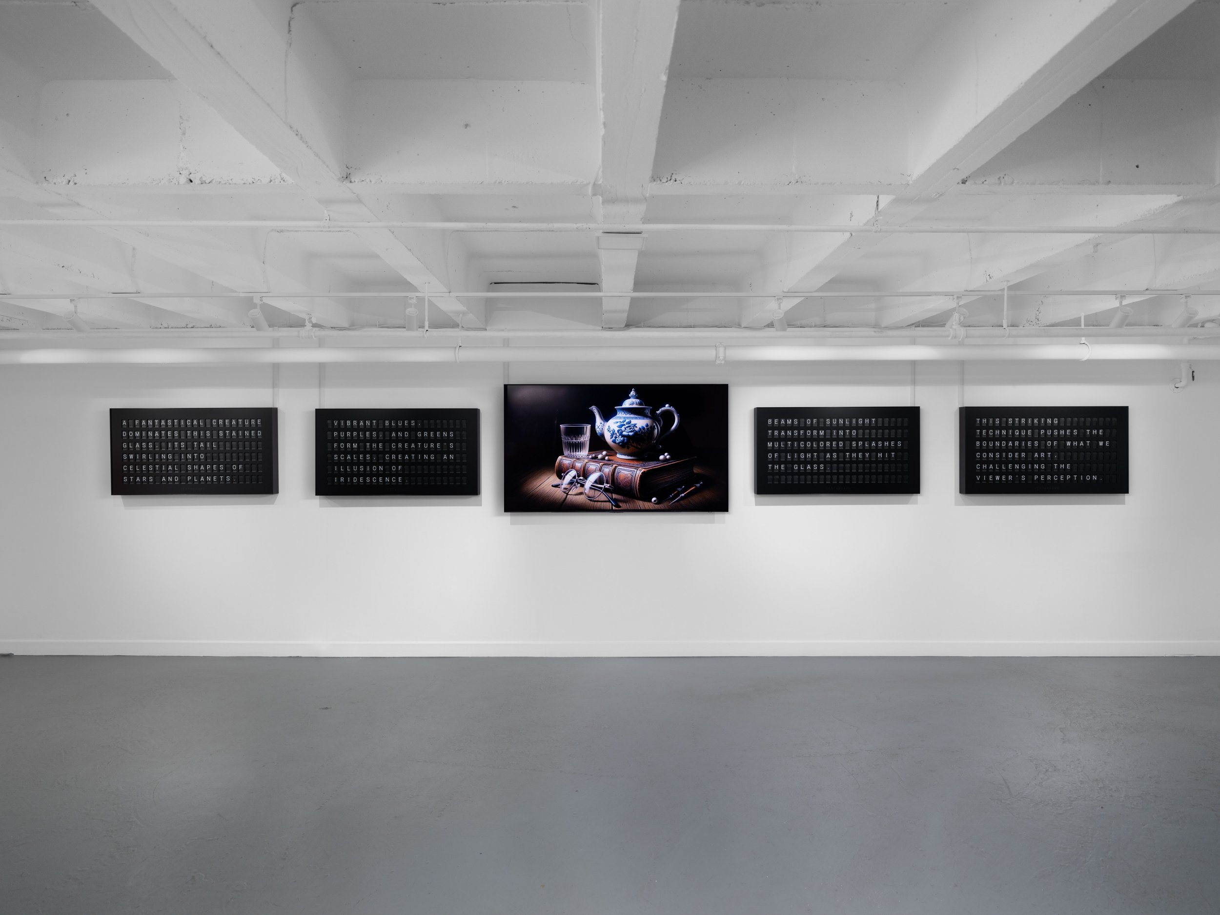 Other works incorporate prompts in real time, transforming input from exhibition visitors into AI-generated images and text. Speak Art Into Life invites viewers to suggest ideas to a microphone, which AI converts into visual outputs that become exquisite corpse-style collaborative images. The images evolve over the course of the exhibition, growing and expanding in unpredictable ways. The use of four classic analog flap displays emphasizes the near-uncanny newness of the cutting edge tech that powers the work. By operating on the leading edge of what technology allows, Reben invites us to imagine possible futures for our relationship to machines, making room for a sense of play and even beauty in the boundaries between language and code.