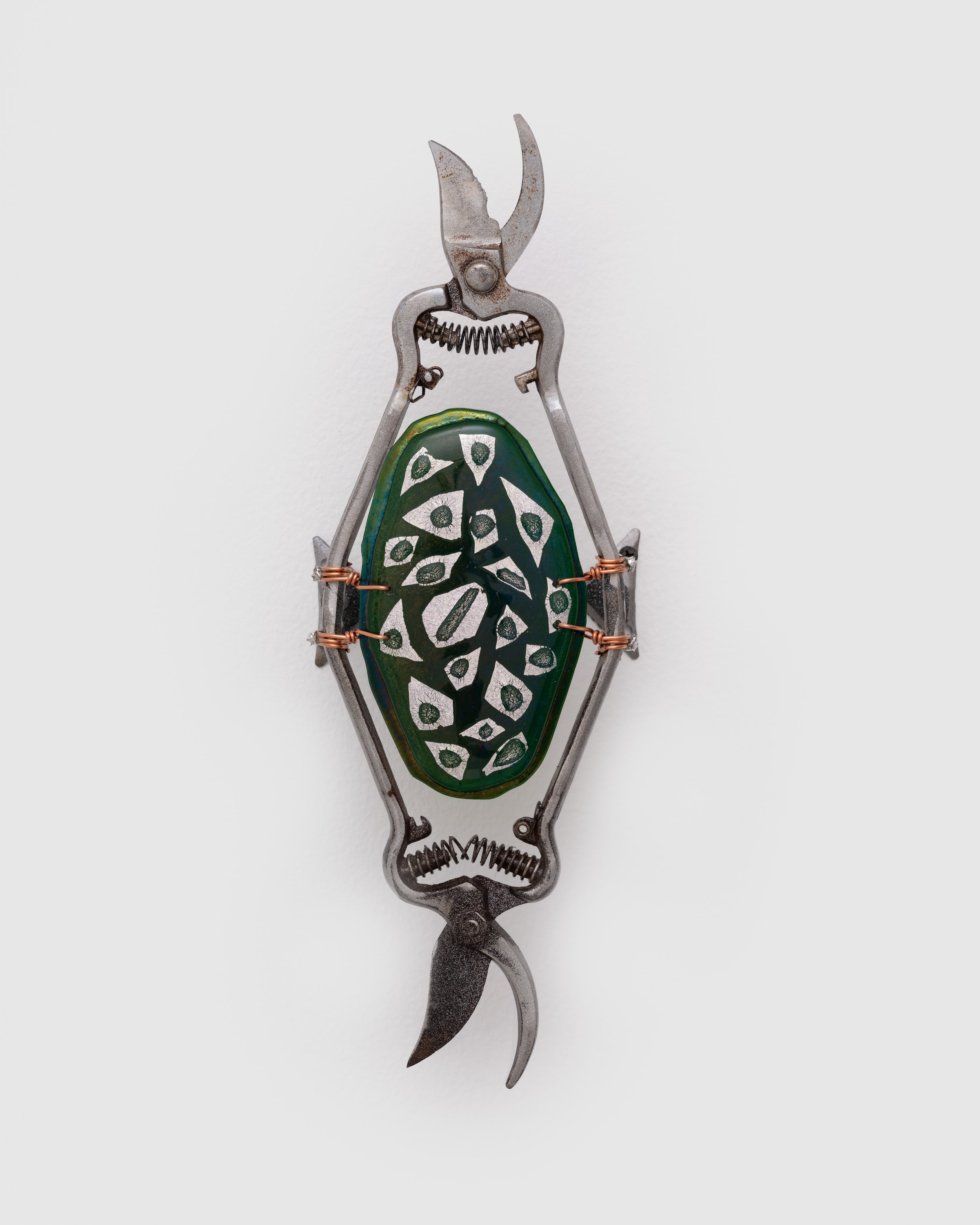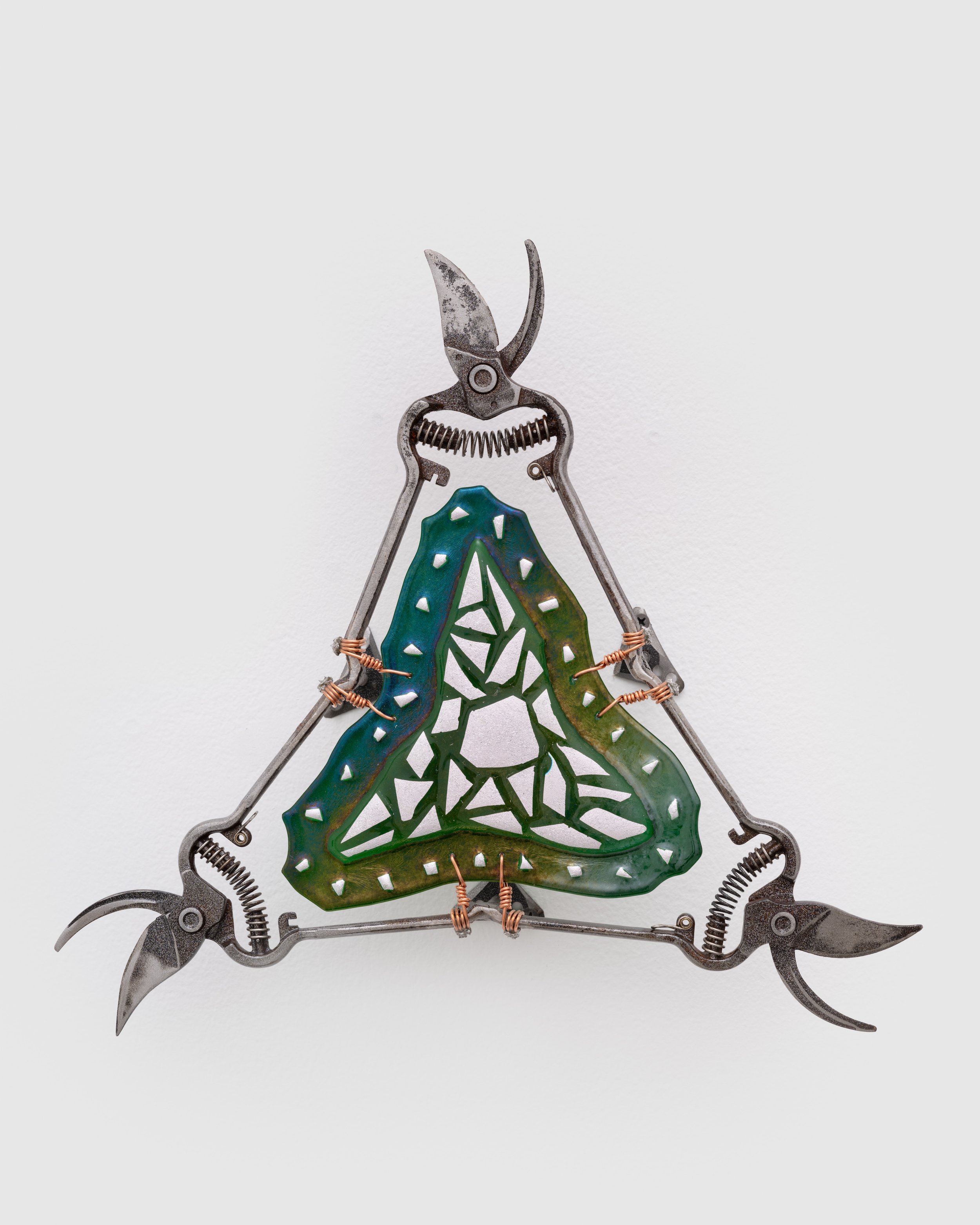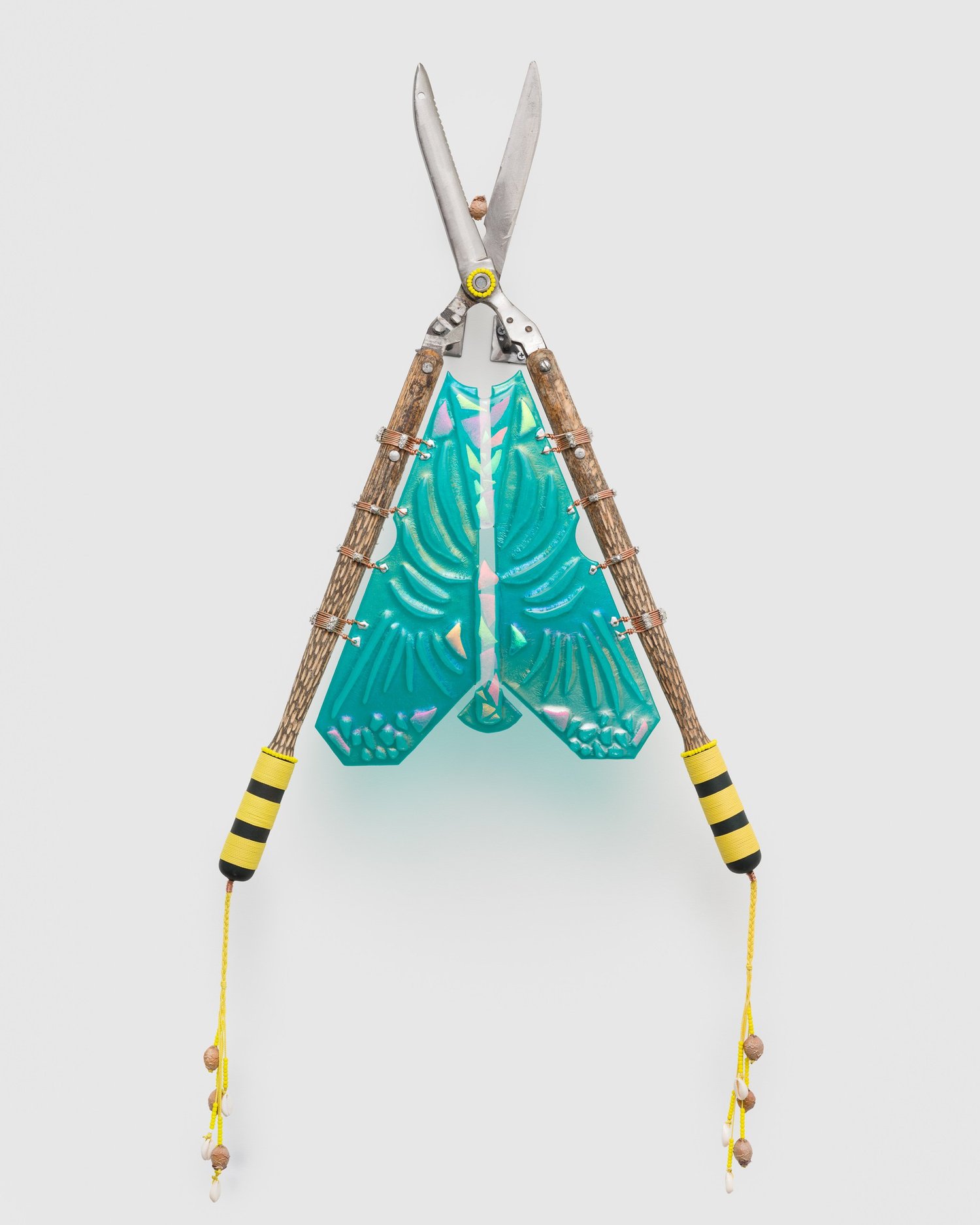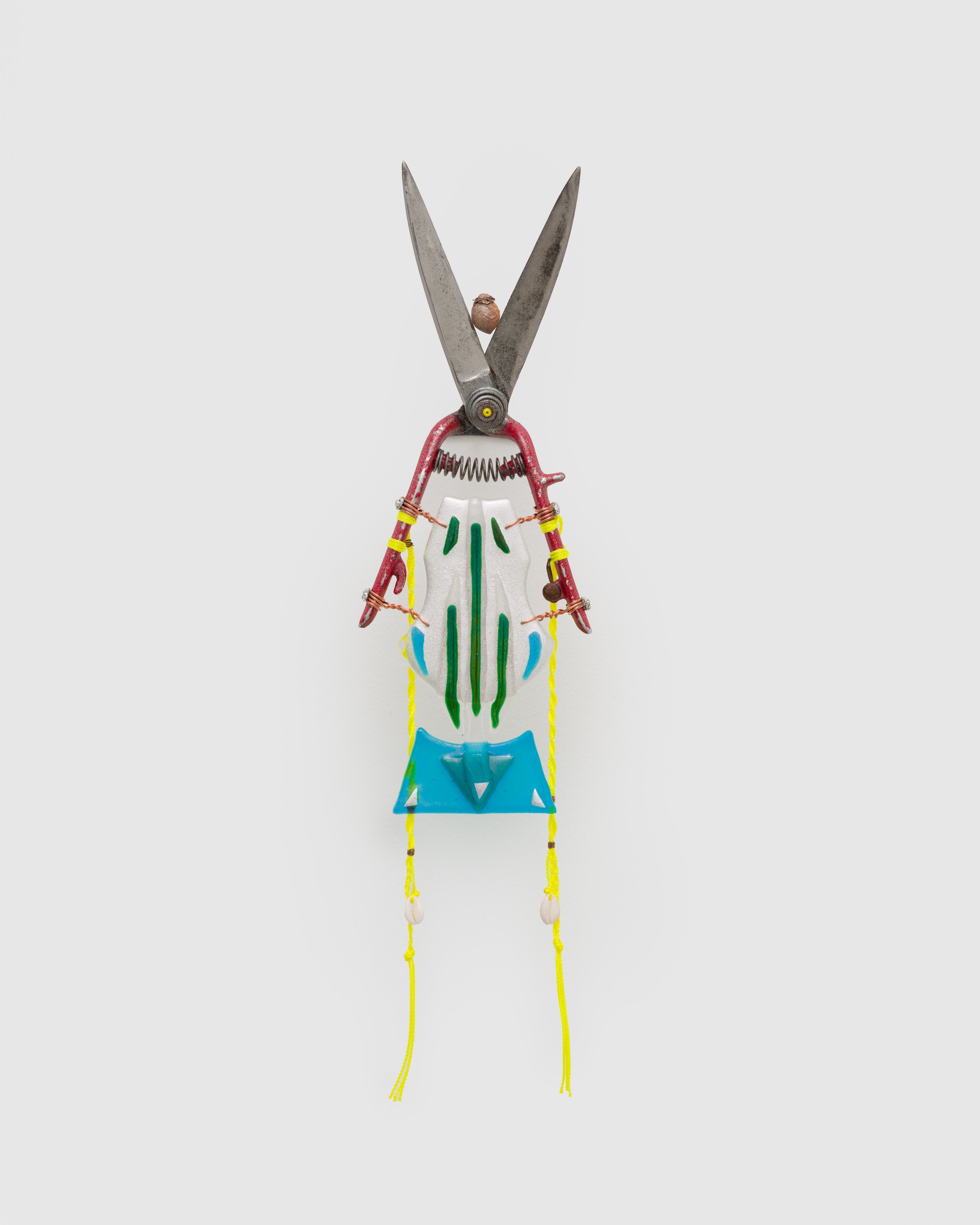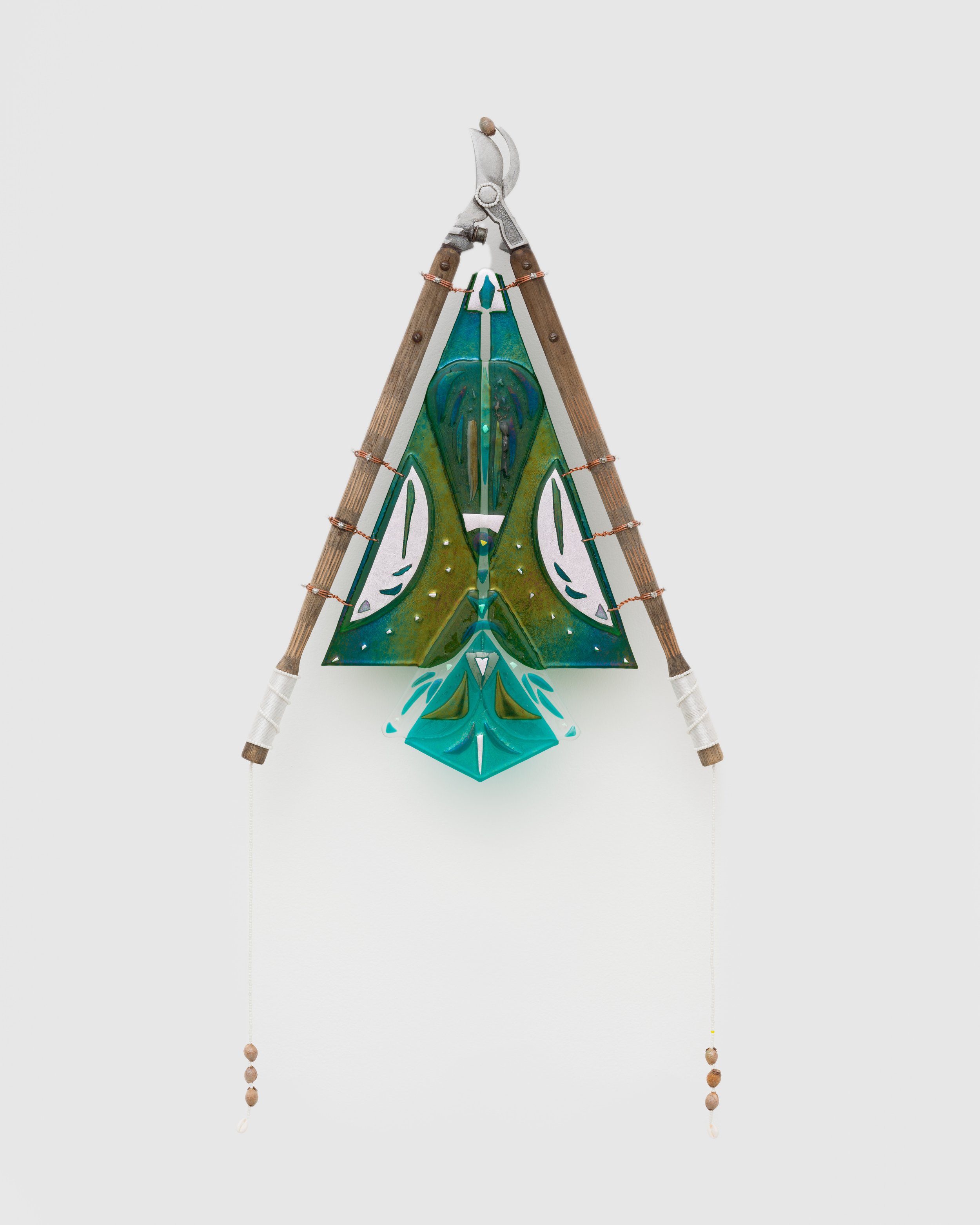 olivas’ objects are imbued with duality: beauty and utility, sharp and soft, earth and heaven. All of these elements come to play in four wall-based sculptures from his Feeding the Birds (Mojuba Iyaami) (2024) series. Here, gardening shears of various sizes have been transformed into opulent devotional objects representing Iyaami, the sacred mothers of Yoruba tradition. These figures often take the form of birds, and olivas’ shears – turned upright, adorned with glittering glass, and trailing braids and beads – recall birds in flight. Bodies of collaged dichroic glass, used primarily in satellite technology, have been kiln-fired to a colorful iridescent sheen that projects our collective prayers into the heavens.