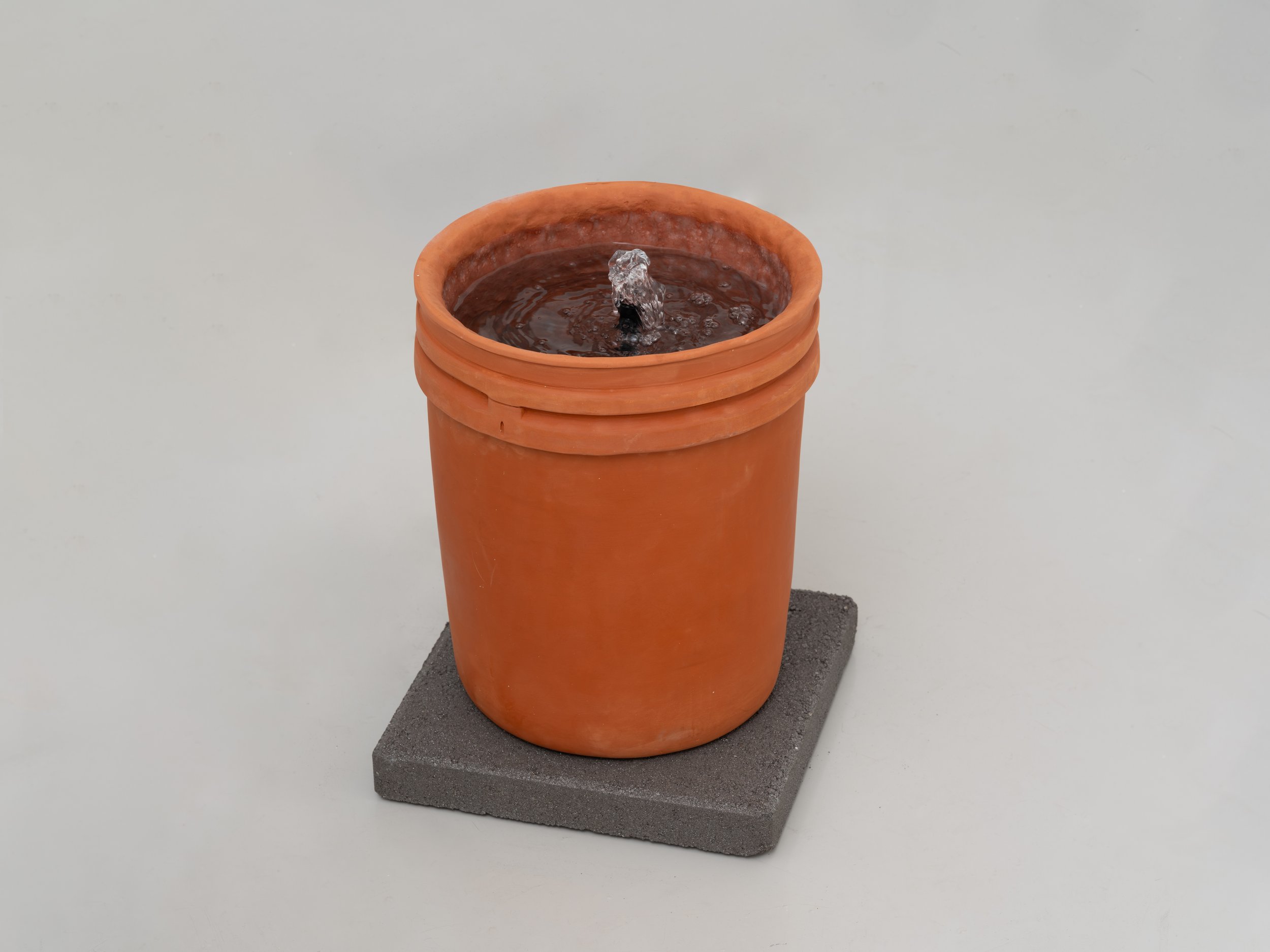 Throughout the gallery hang three Freedom Portals, works from the Windows into Heaven (2023) series that offers conduits to another world, or perhaps another worldview. Small pruning shears have been fused together to create enclosed interiors that hold collaged dichroic glass forms that resemble both the infinite stretch of deep space and the humble paddle of a cactus. A hazy boundary between the cosmic and the ordinary characterizes much of olivas’ work, their edges intentionally blurred. Elsewhere in the gallery, an everyday five-gallon bucket formed from terracotta clay holds a gently bubbling fountain, its cool waters encouraging calm and coolness in a heated time and a call to the ancestors who spring from the cool waters.