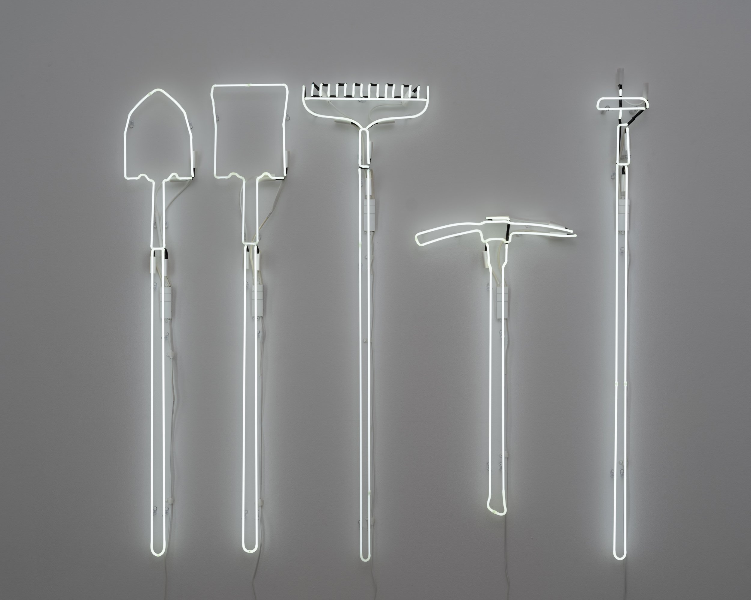 The smaller back gallery holds five long-handled tools formed in neon. The soft buzz and glow of these Herramientas espirituales (2024) creates a hushed, chapel-like space, one which invites the viewer to imagine the ways in which we can continue the work of our predecessors toward liberation. Now is the time to build a coalition and do the work this day requires, olivas suggests.