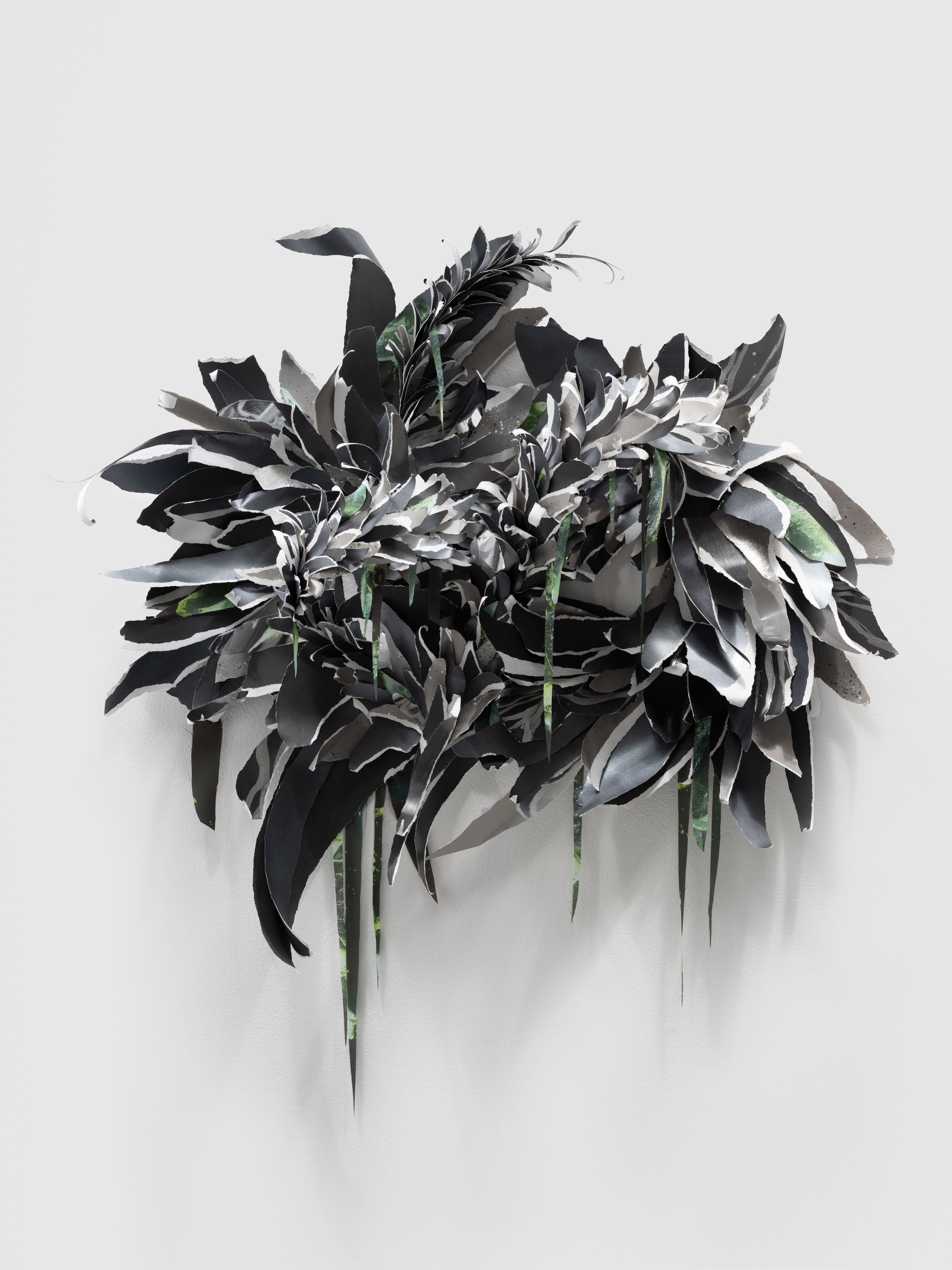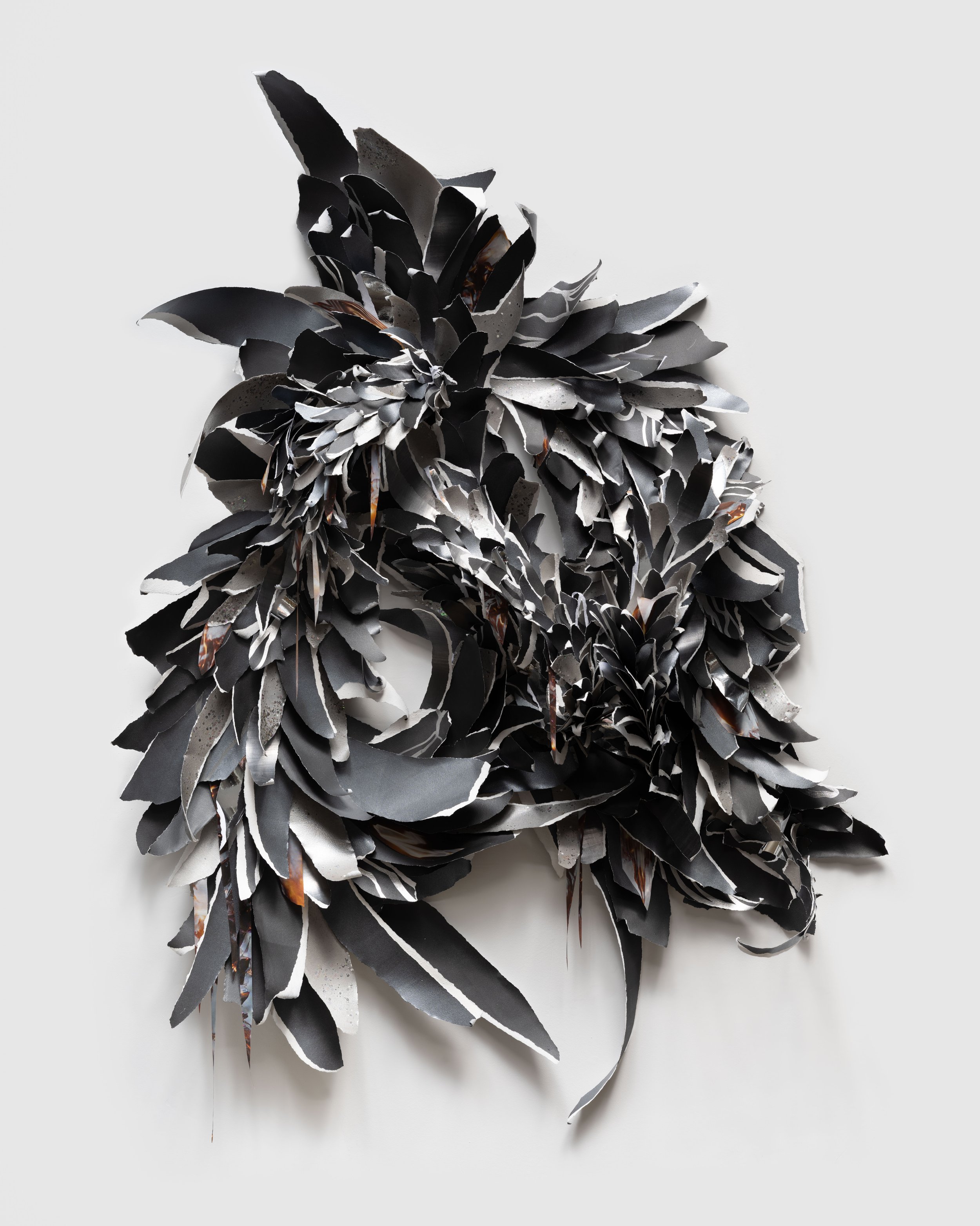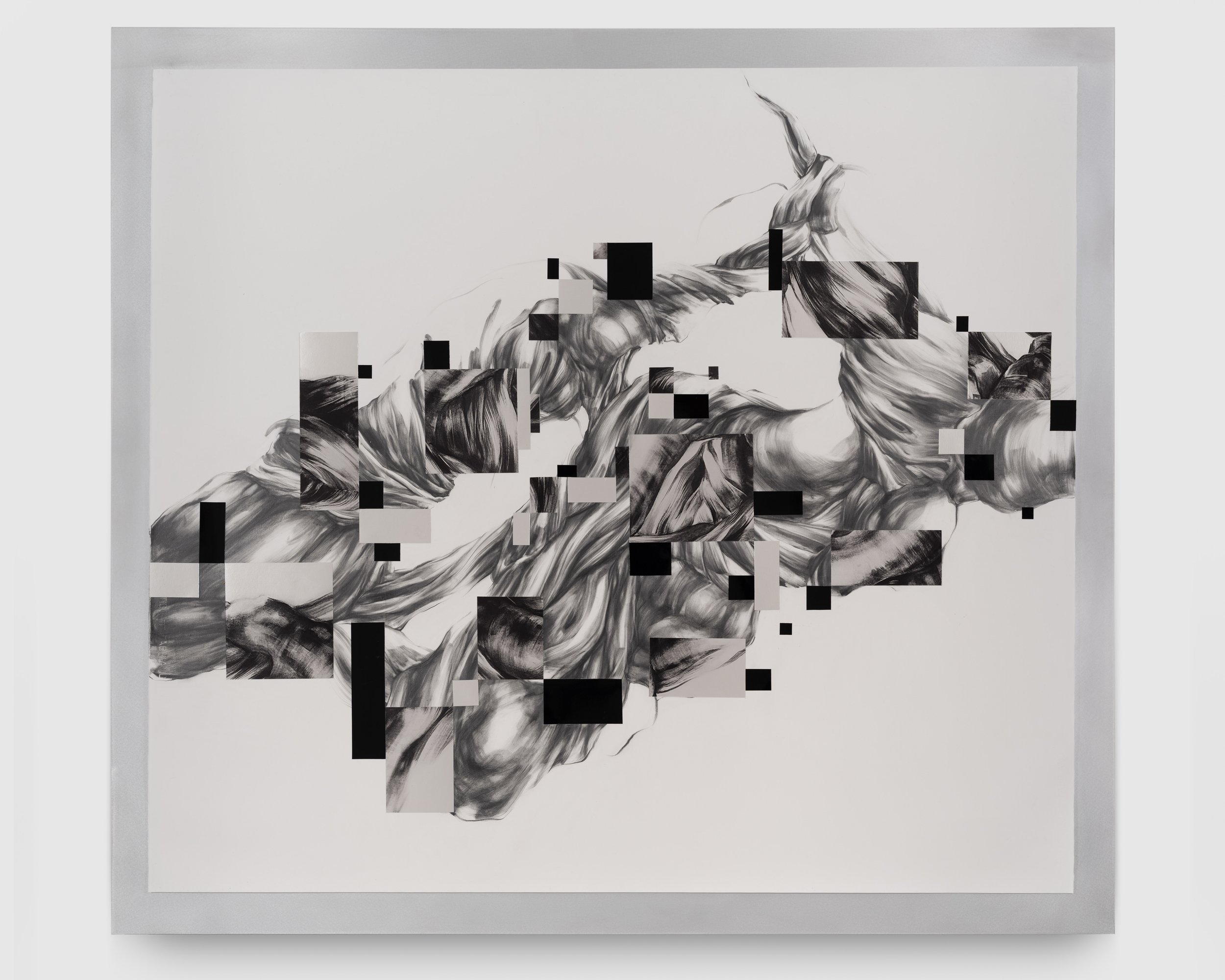 The Widows, a series of wall-based sculptural works evocative of elaborate flora or dramatically plumed birds, are built from torn paper and printed silk heavy with graphite, ink, and paint. Three Widows hang in the main gallery of the exhibition. If the jagged edges darkened with carbon recall a fire’s charred remains, these works are the phoenix rising from the ashes, demonstrating the constant cycle of death and rebirth. Their beauty evinces an ecofeminist sense of hope, a faith in nature’s vast capacity for healing and regeneration. The primary floor of the exhibition also includes a suite of Distortion collages in a range of sizes. These works combine soft graphite drawings and collaged elements on white iridescent paper, mounted to aluminum, creating a sense of irresolvable space between the digital and the physical. Each element reads as an isolated pixel in a larger image and as a window into a wider world, collapsing distinctions between natural and manufactured perspectives.