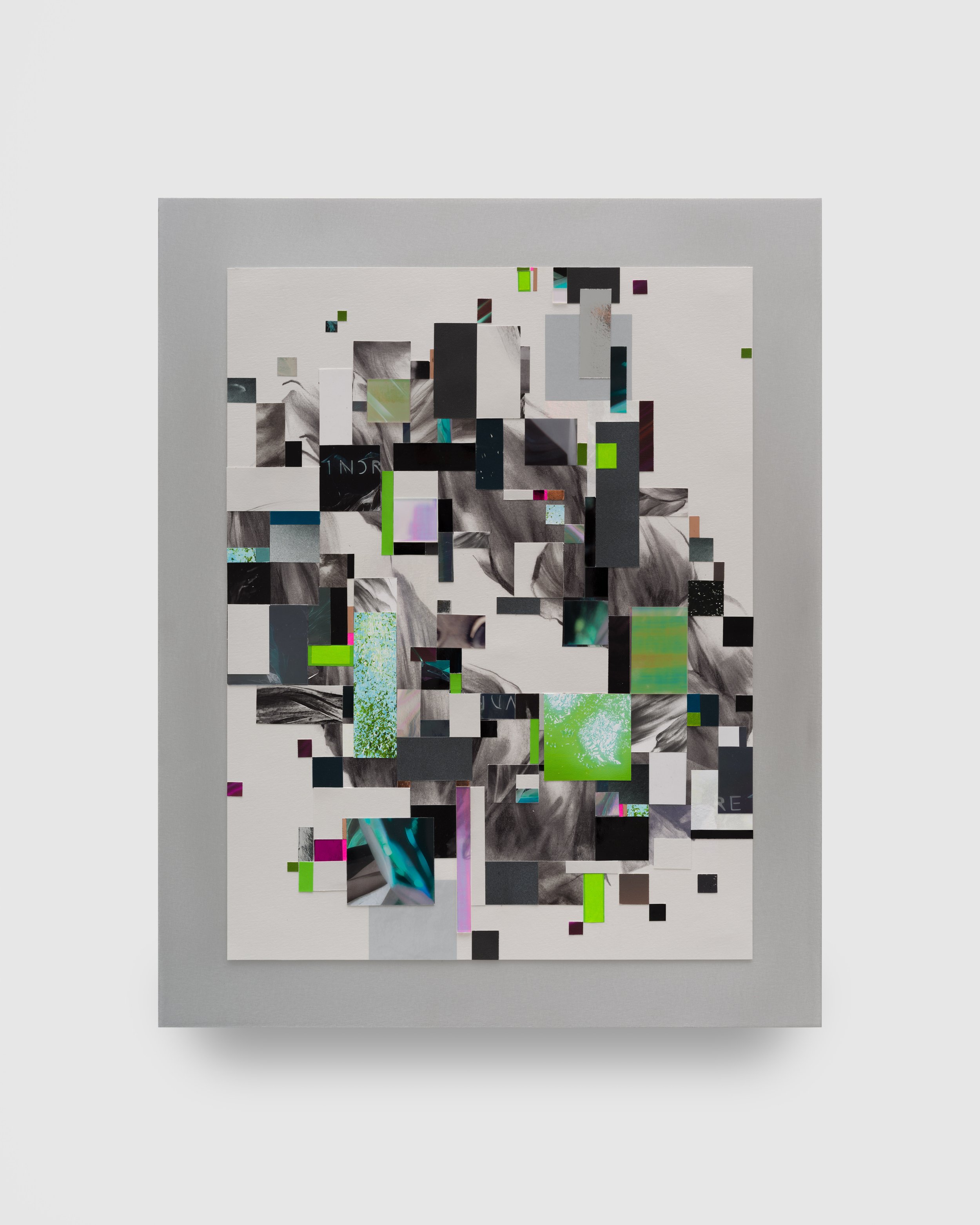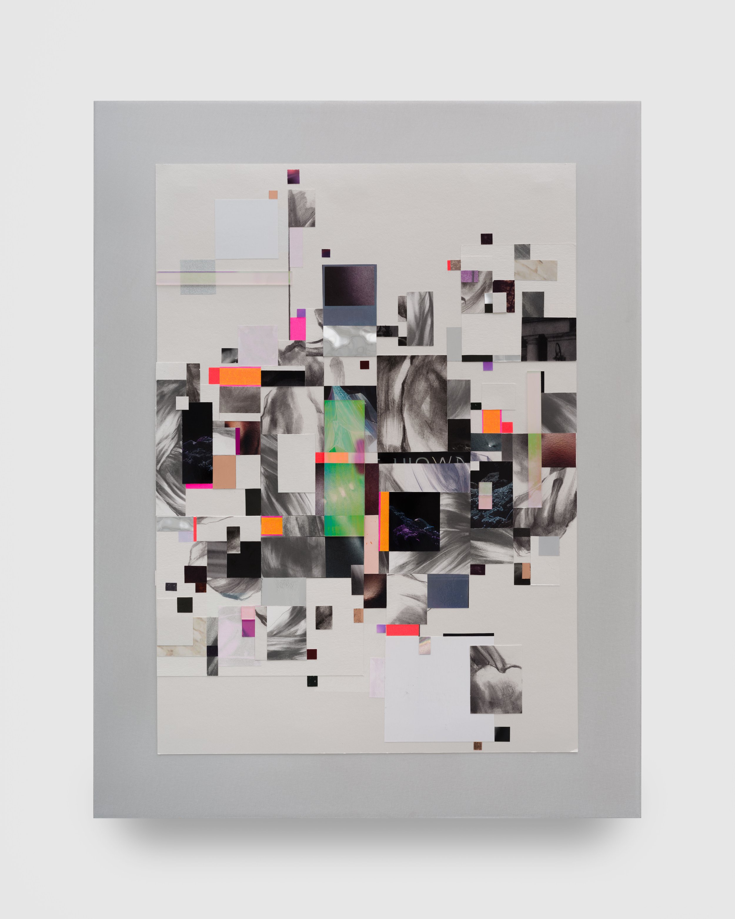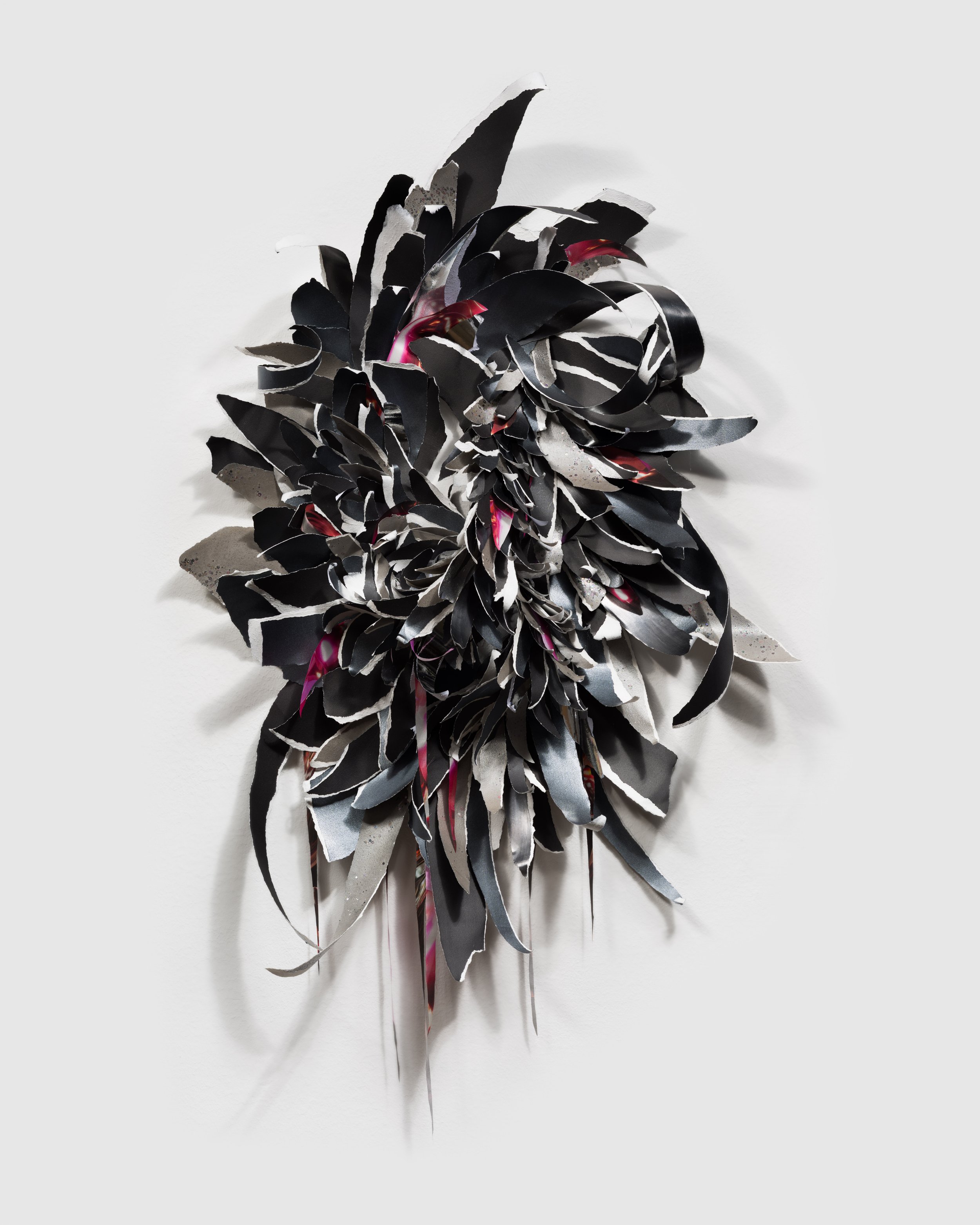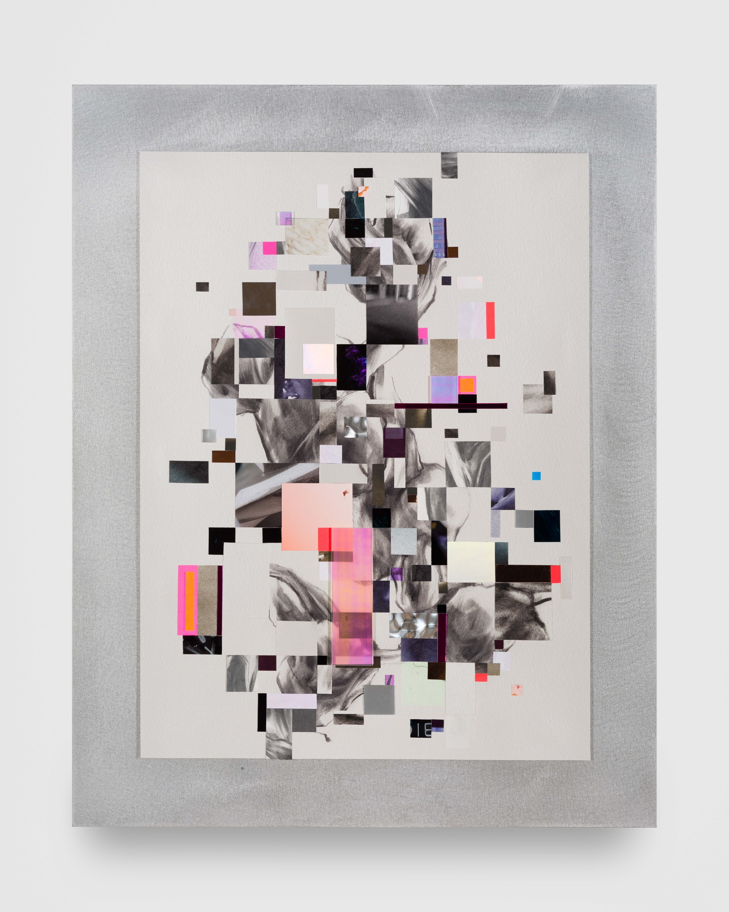 The Widows, a series of wall-based sculptural works evocative of elaborate flora or dramatically plumed birds, are built from torn paper and printed silk heavy with graphite, ink, and paint. Three Widows hang in the main gallery of the exhibition. If the jagged edges darkened with carbon recall a fire’s charred remains, these works are the phoenix rising from the ashes, demonstrating the constant cycle of death and rebirth. Their beauty evinces an ecofeminist sense of hope, a faith in nature’s vast capacity for healing and regeneration. The primary floor of the exhibition also includes a suite of Distortion collages in a range of sizes. These works combine soft graphite drawings and collaged elements on white iridescent paper, mounted to aluminum, creating a sense of irresolvable space between the digital and the physical. Each element reads as an isolated pixel in a larger image and as a window into a wider world, collapsing distinctions between natural and manufactured perspectives.
