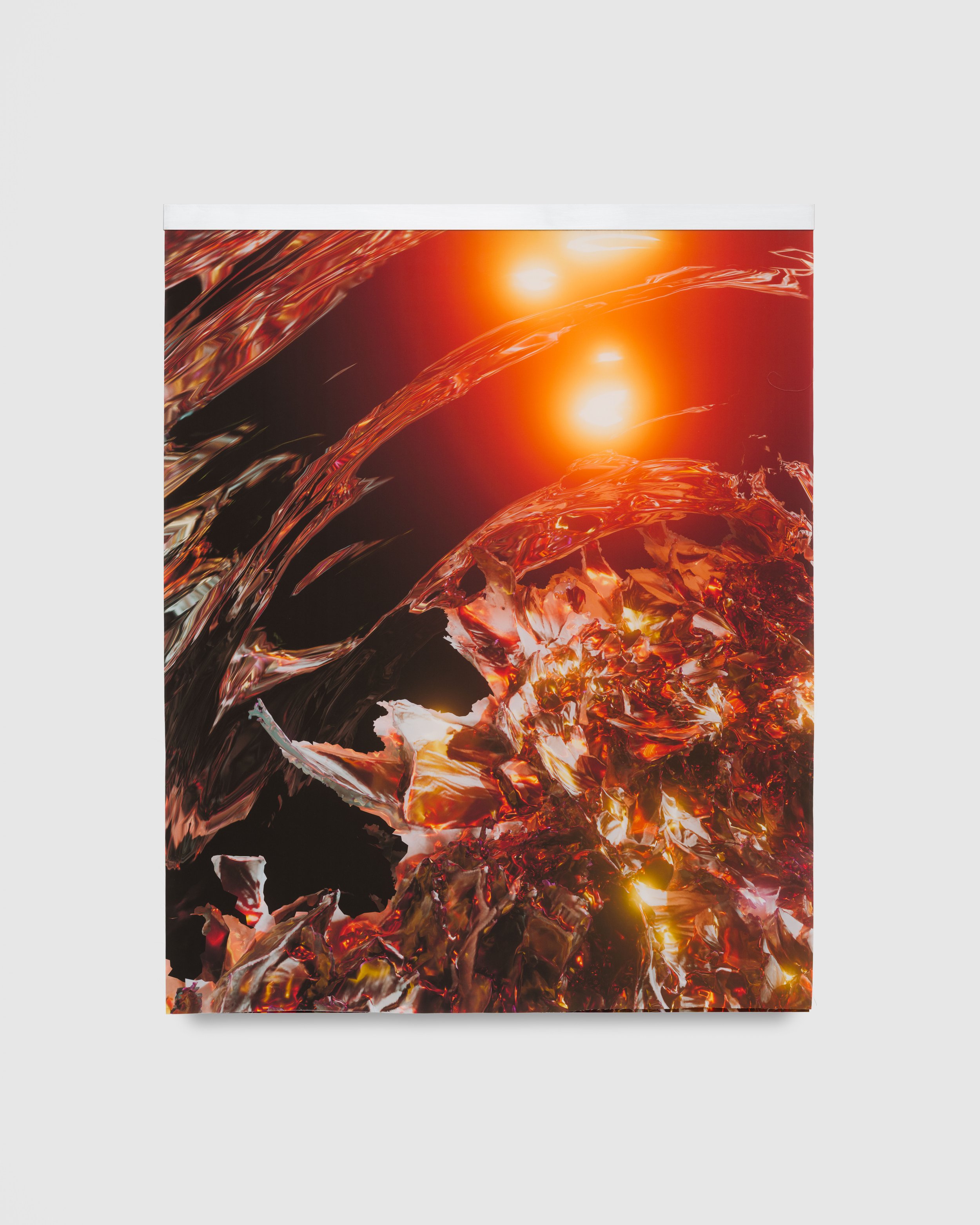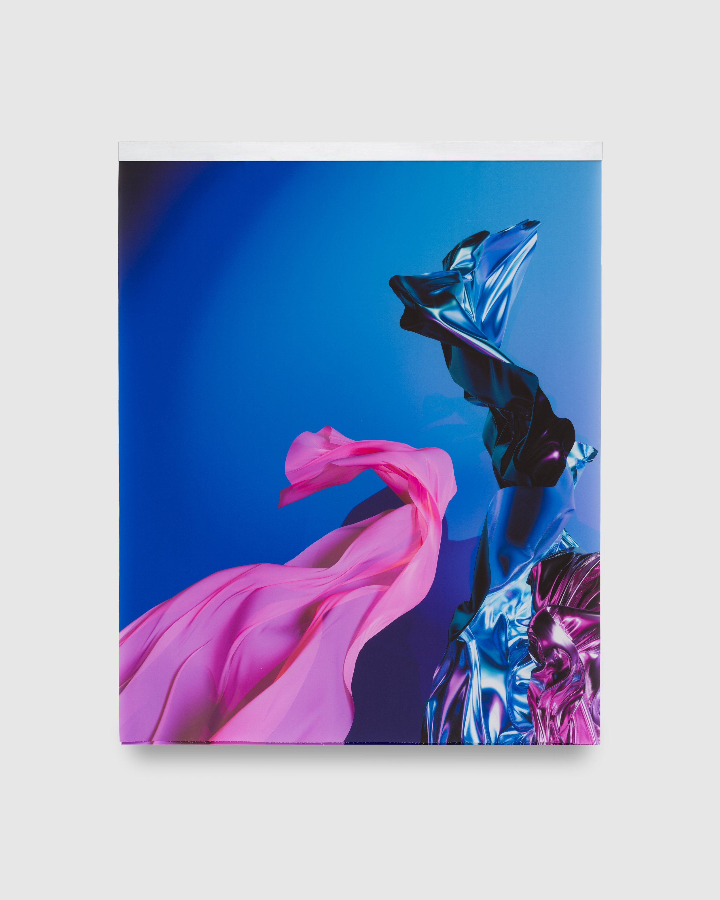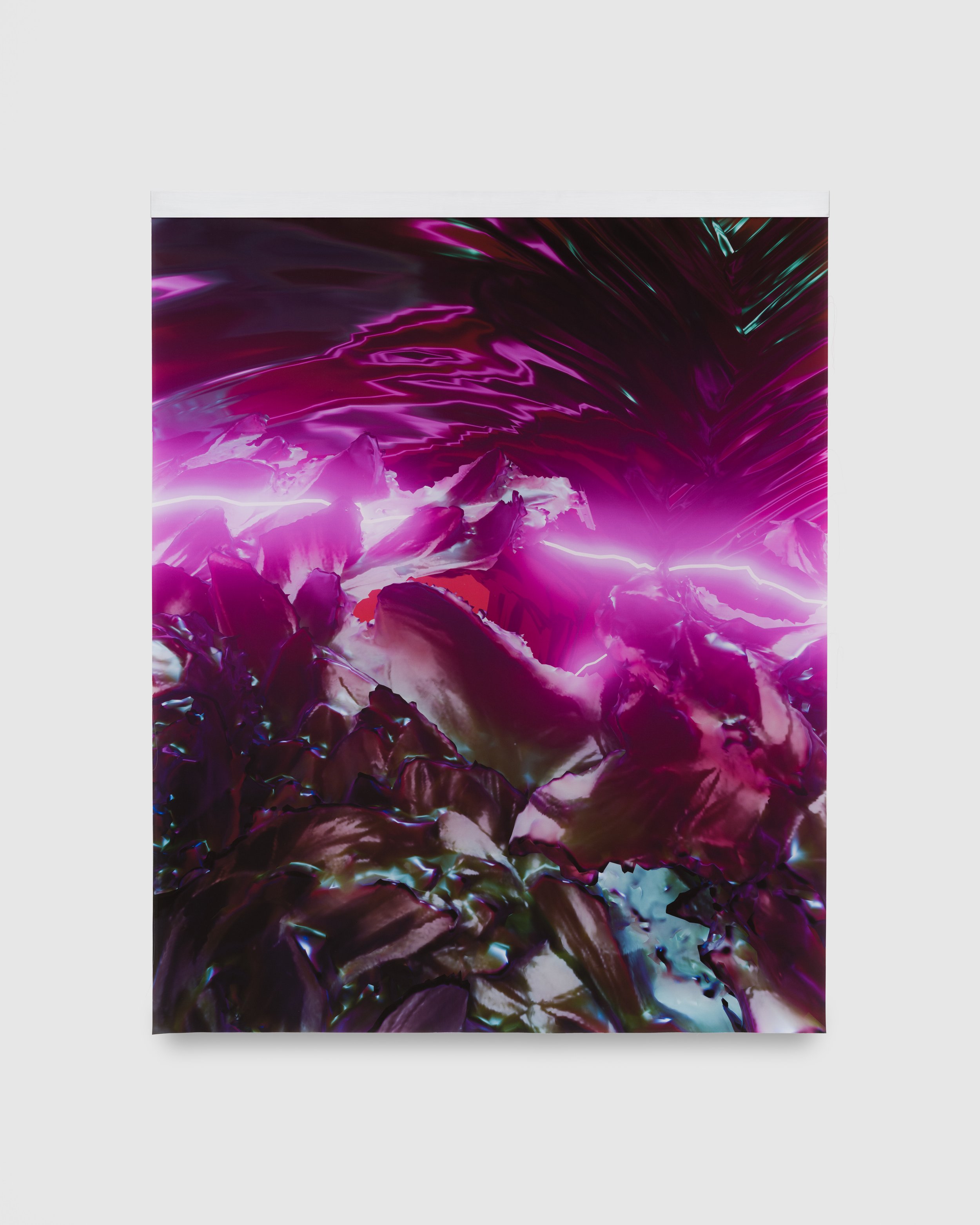 The exhibition opens with nine luscious Pia Mater works, in which crisp, vibrant digital images are doubled and layered, once on a firm canvas base and again on a sheet of silk that flutters with the ambient breeze. Baker Cahill plays with luminosity in these imagined spaces, accentuating the diversity of texture and material that coexists within. These works play with the fragility of perception, pairing soft and hard, fixed and free. “Pia Mater” translates to 'tender matter’, and is the delicate protective membrane that encases the human brain. An interest in cognition and processing runs through the exhibition, where images from one series or archive are used as material for another – the Pia Mater images, for example, show up again in the Carbon films. This iterative process utilizes a personalized dataset to “train” Baker Cahill’s work in a manner similar to the way artificial intelligence is trained on vast reams of existing data, while at the same time paying homage to the rich history of recombination in digital art.