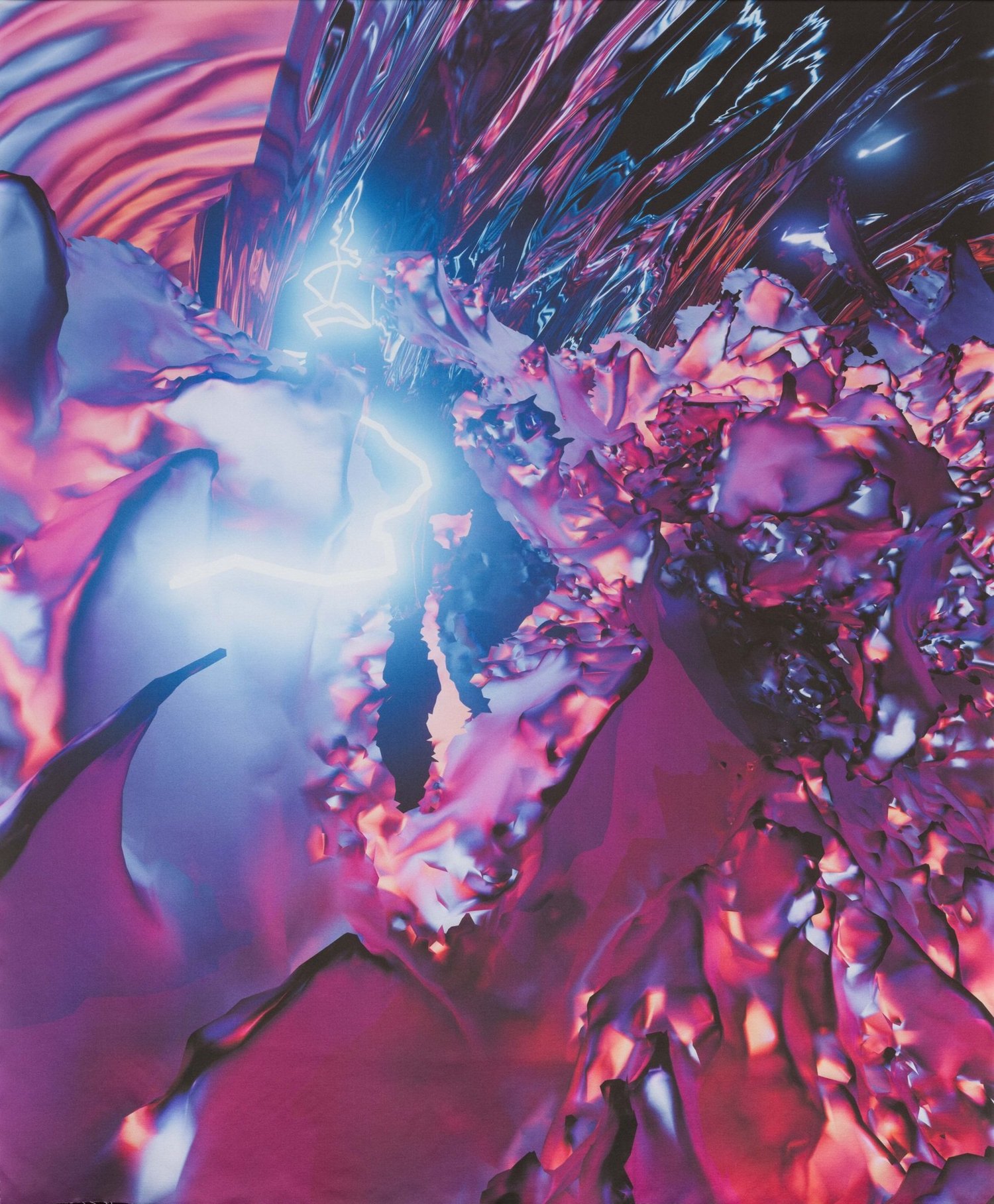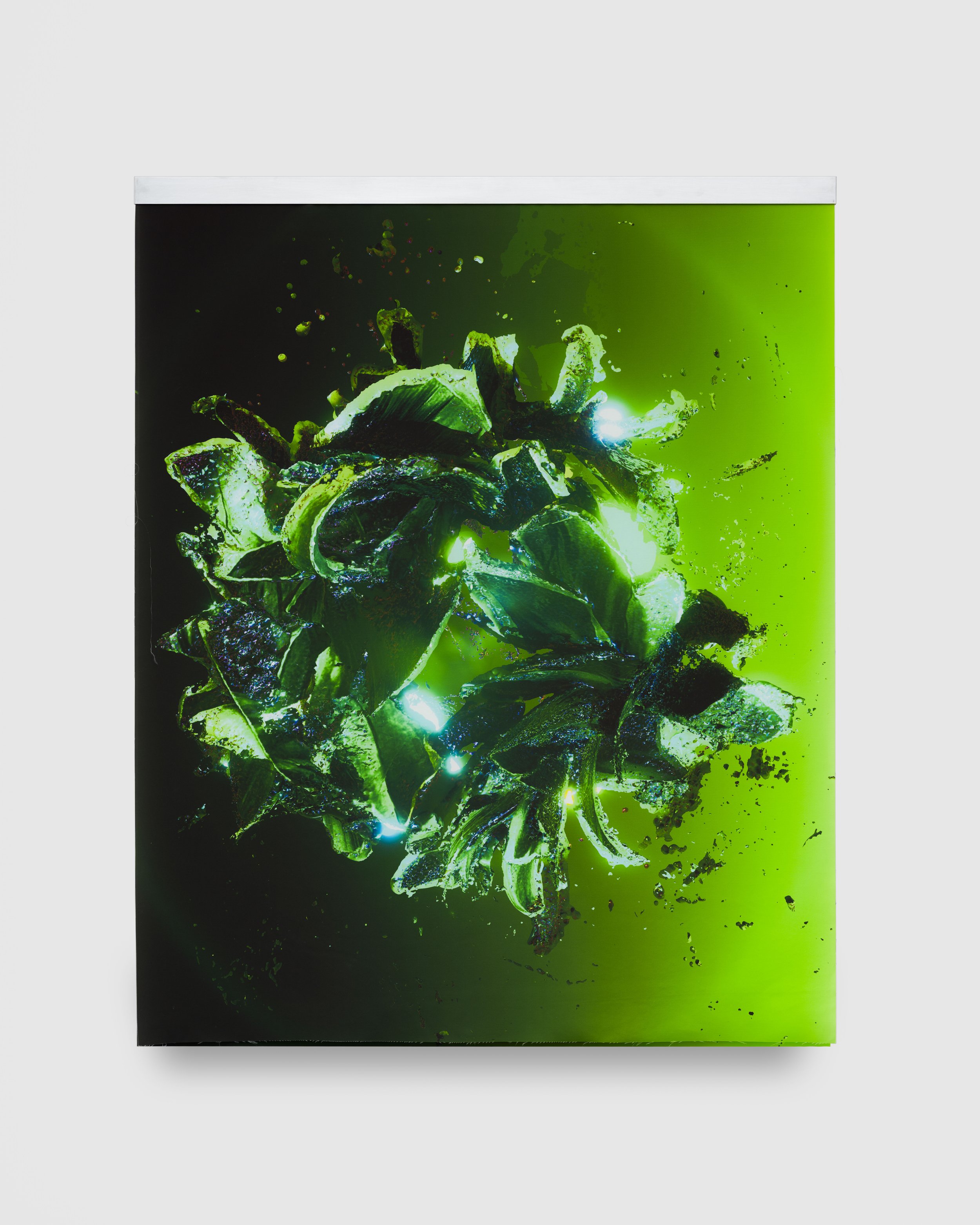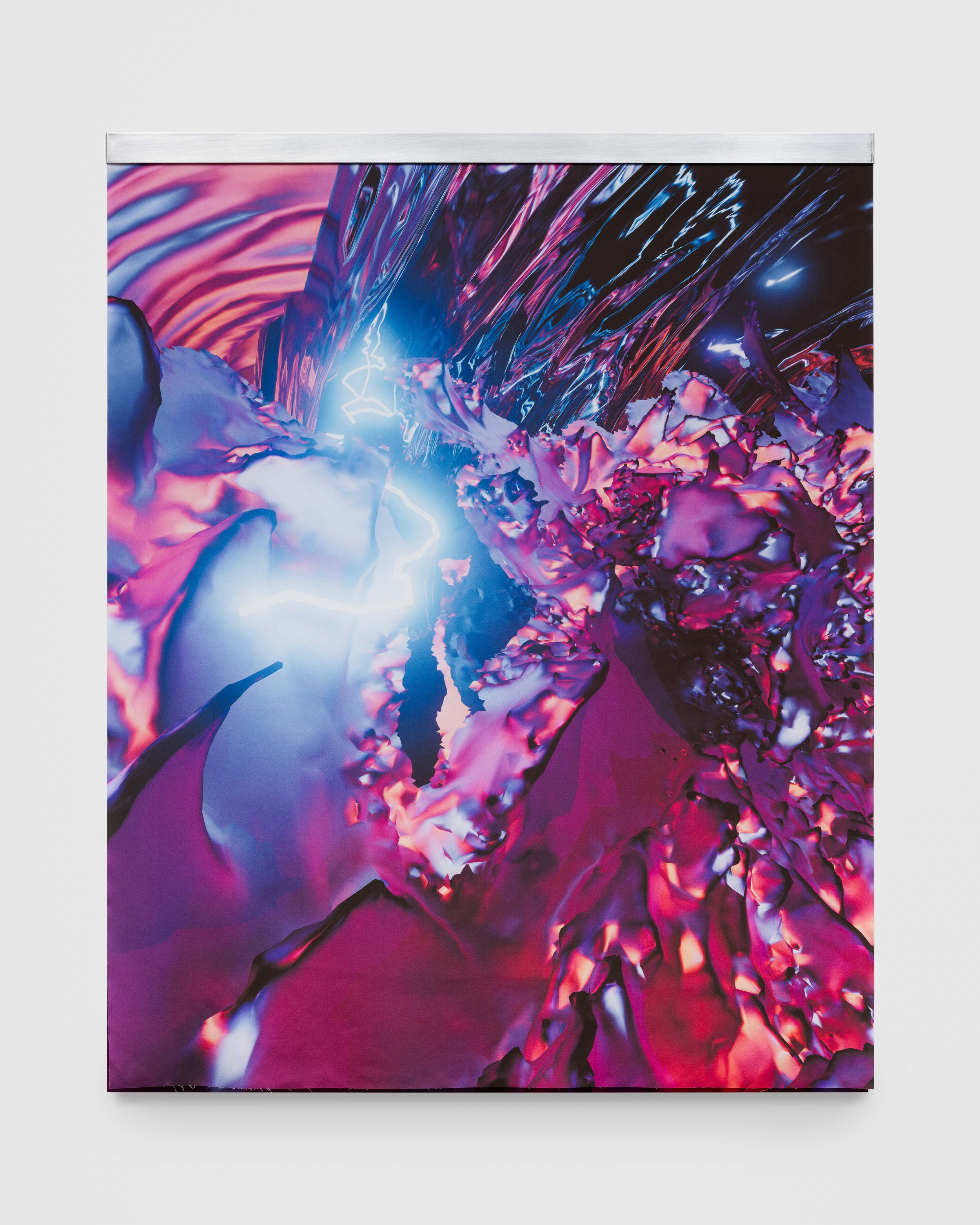 The exhibition opens with nine luscious Pia Mater works, in which crisp, vibrant digital images are doubled and layered, once on a firm canvas base and again on a sheet of silk that flutters with the ambient breeze. Baker Cahill plays with luminosity in these imagined spaces, accentuating the diversity of texture and material that coexists within. These works play with the fragility of perception, pairing soft and hard, fixed and free. “Pia Mater” translates to 'tender matter’, and is the delicate protective membrane that encases the human brain. An interest in cognition and processing runs through the exhibition, where images from one series or archive are used as material for another – the Pia Mater images, for example, show up again in the Carbon films. This iterative process utilizes a personalized dataset to “train” Baker Cahill’s work in a manner similar to the way artificial intelligence is trained on vast reams of existing data, while at the same time paying homage to the rich history of recombination in digital art.