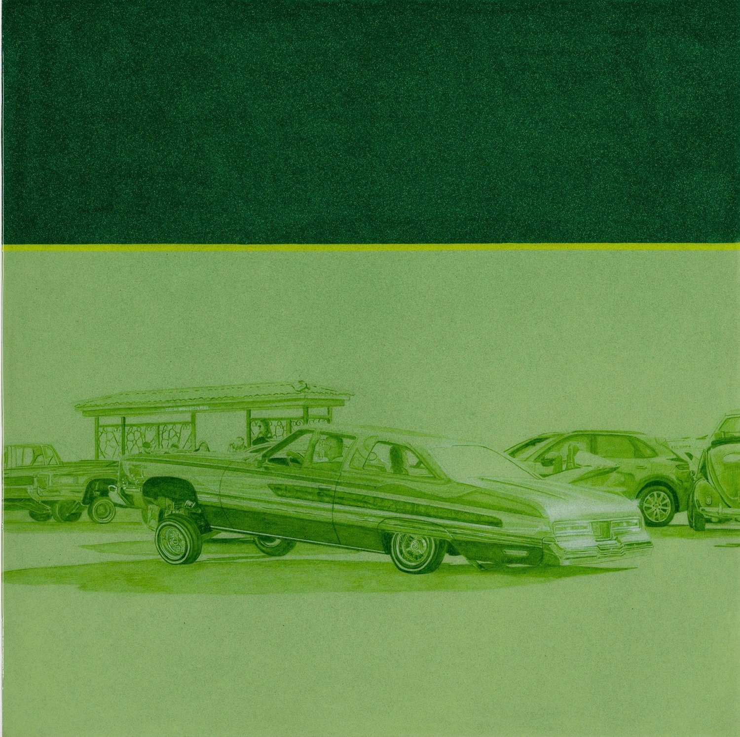 The work celebrates and embodies the lowriders and car clubs of L.A.’s Chicano community. Executed by both brothers in tandem, the monochromatic, tone-on-tone acrylic paintings take their color directly from the candied gloss color palette of lowriders. The brothers choose subjects from a personal archive of photographs, gathered over a lifetime immersed in the lowrider scene. Many of the works include sculptural elements familiar to car culture: engraved chrome trim pieces run across compositions, mirrors are tiled below tires as if to provide the viewer a glimpse of a gleaming undercarriage. In this way, the works transcend their status as painting and become like cars themselves, adorned with precise murals and finished with a sparkling resin glaze. The compositions have been distilled to their essence – everything comes back to the cars – but still convey a sense of community pride, not only in the lowriders but in the people and culture that surround them.
