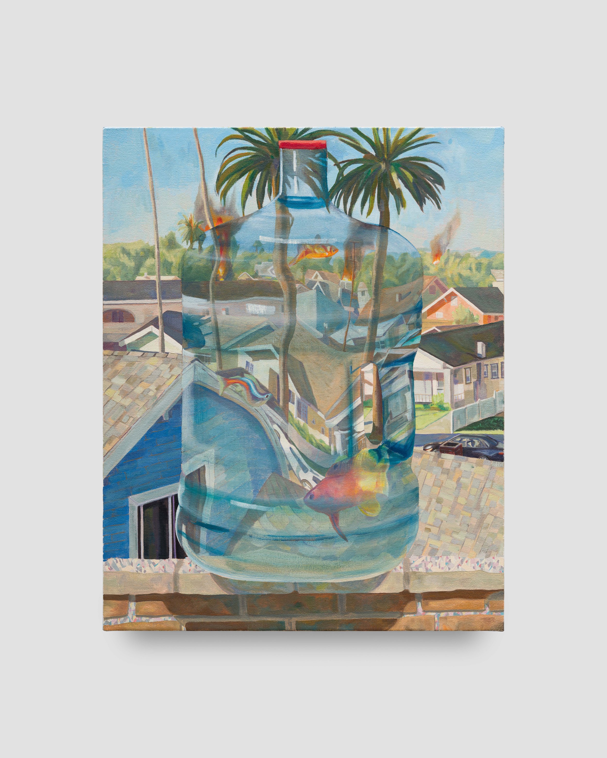 The particular quality of California light is important to understanding Guevara’s works. His interest in California color bloomed while in art school in New York as a way to counteract that city’s prevailing grey and brick palette. His study of Bay Area painters such as Wayne Thiebaud and Elmer Bischoff comes through in his use of rich, saturated color that brings a sense of playful light to areas of both sun and shadow. The rooftop landscape Ghetto Bird View brings this sensibility to South Central. A portrait of both the family home and a major site of looting in 1992, this work combines the light’s particular beauty and the ever-present reminder of unrest. In this remixing of family history and personal experience, Guevara processes the impact of political unrest on his own life and his wider community, both strengthening his connection to the past and grounding himself in the very present.