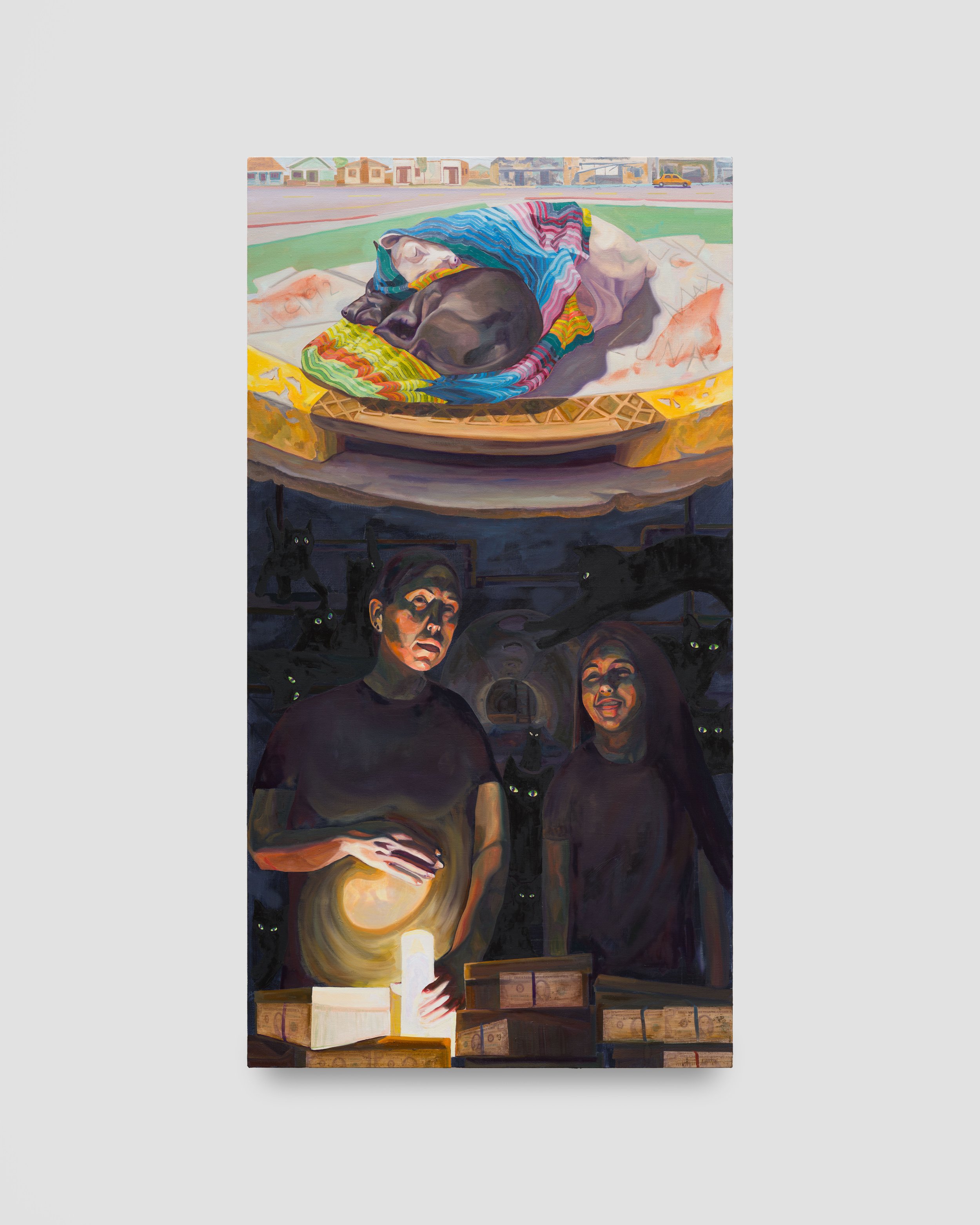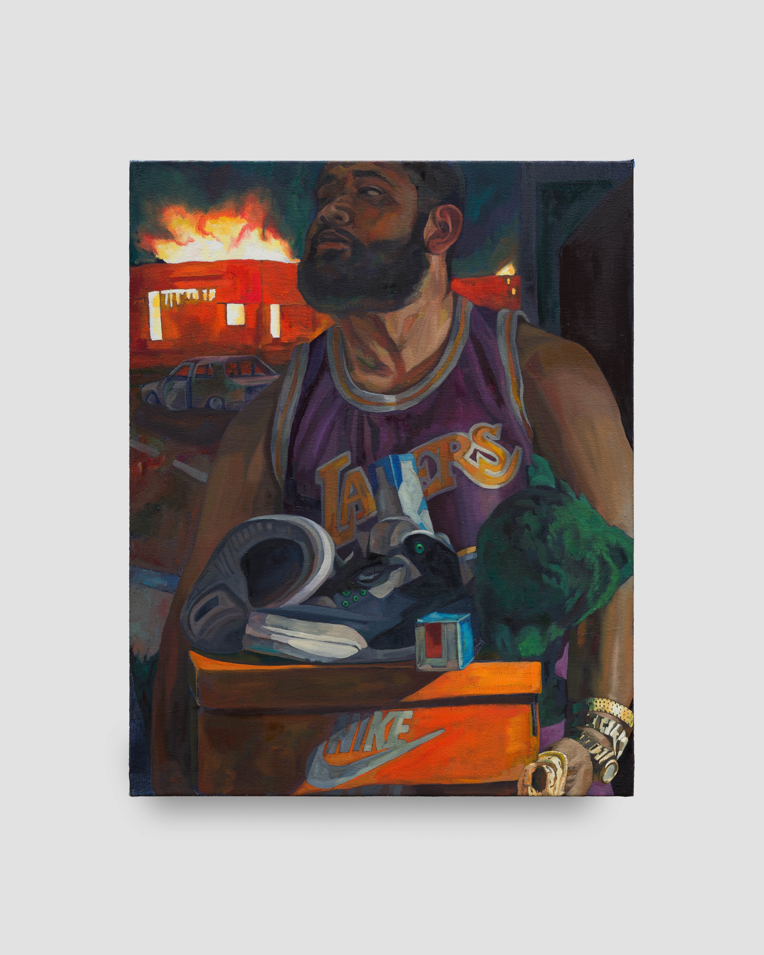 Mural-sized painting The Get Down is Guevara’s largest to date, stretching to nearly 14 feet. It depicts an amalgamation of scenes from the 1992 events, including not only a tussle between the central five men with looting and burning in the background, but also children playing and witnessing the event. The figures are rendered nearly life-sized, creating a bodily experience that places the viewer in the midst of the action. Guevarra relishes the very distinct fashion and color palette of the 1990s – jerseys of popular sports stars find their way onto several figures, and bright, primary colors add a popping visual energy to the chaotic scenes. Here, the chaos is aided by supernatural forces: skeletons pour gasoline on the fire and call for backup, black cats dot the landscape, and an ominous oarfish snakes across the ground. These elements underscore an interest in the power we give to symbols and the ways in which lives can change in an instant.