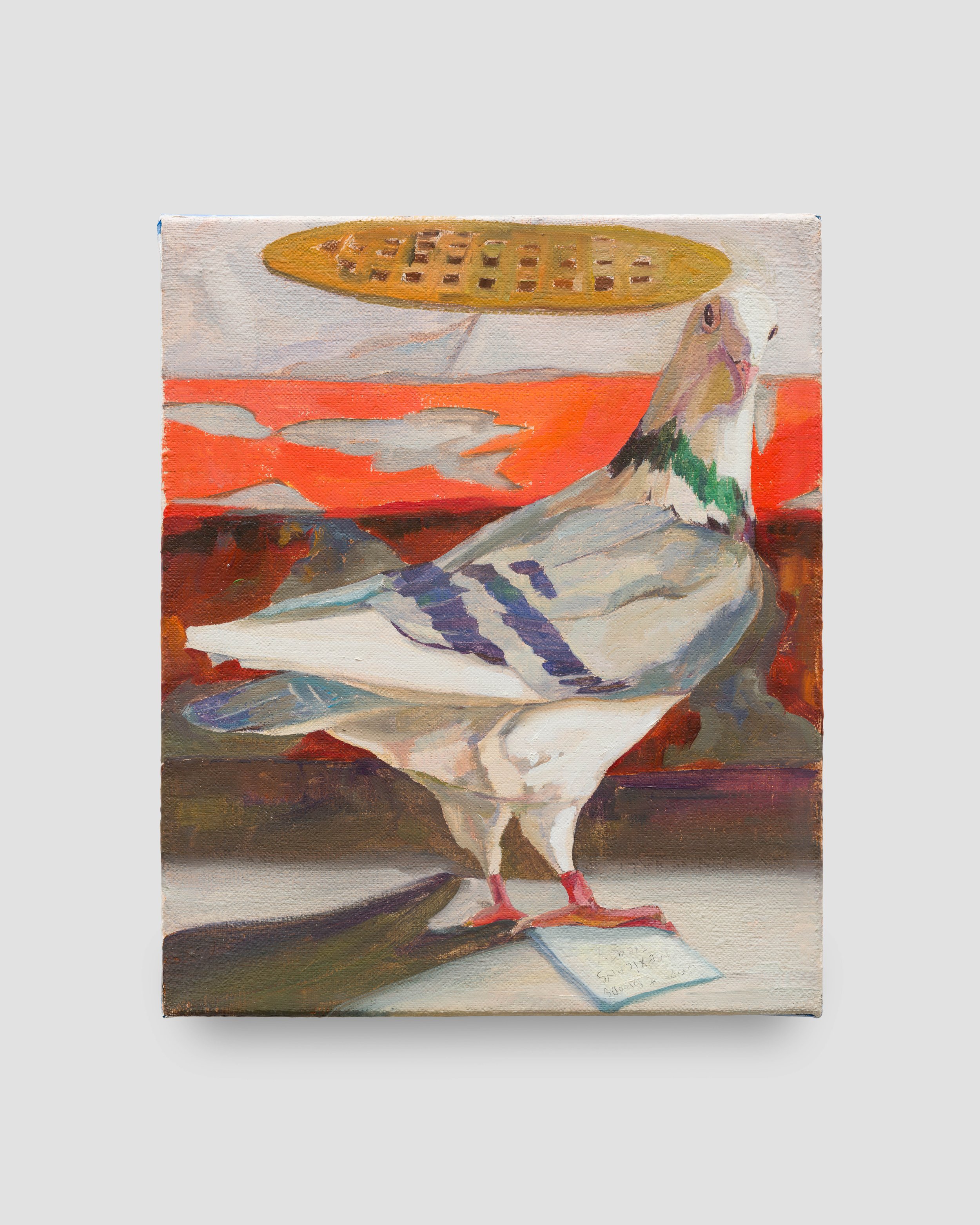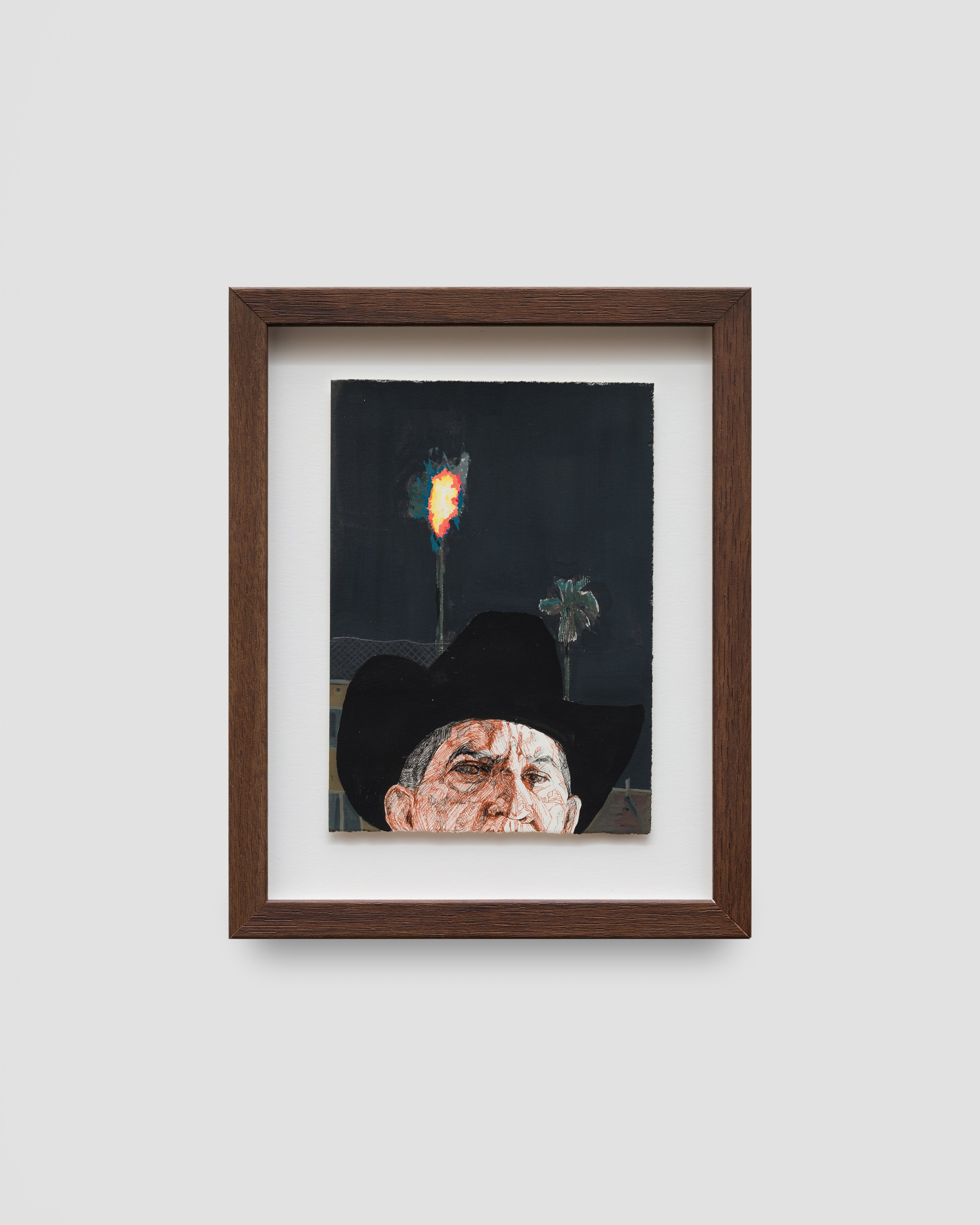 Guevara often riffs on art historical precedent, posing his contemporary figures as Renaissance nobles and saints. The large self-portrait Couple Hours after 3:15pm mirrors the figure of the 17th-century painting Portrait of a Man with a Sheet of Music from the Getty Museum collection. The classical setting has been swapped for a Los Angeles sidewalk, where the figure sits holding a newspaper announcing the beating of Rodney King. The scene appears placid at first, but the violent headline is echoed in the painting’s title – referencing the time at which the officers’ acquittal was announced – and the flames that erupt in the far distance. The contrast between the sunny California scene and the eminent violence glimpsed behind builds a tension that plays out across the exhibition.